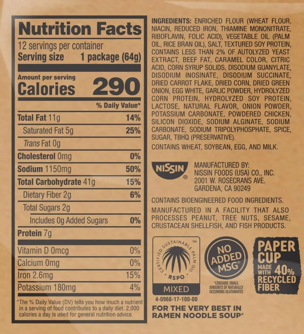 ·From the makers of Top Ramen and RAOH comes another classic—Nissin Cup Noodles in savory Beef flavor. This ready-in-minutes cup offers the ultimate convenience without skimping on taste. The original instant ramen in a cup, now with reduced sodium and no added MSG, remains a quick and portable meal perfect for on-the-go, after-school, or late-night snacking. Simply add boiling water, wait 3 minutes, and stir to enjoy a satisfying serving of hearty vegetables and rich beef-flavored broth. This 12-case package ensures you're stocked for whenever the craving hits.