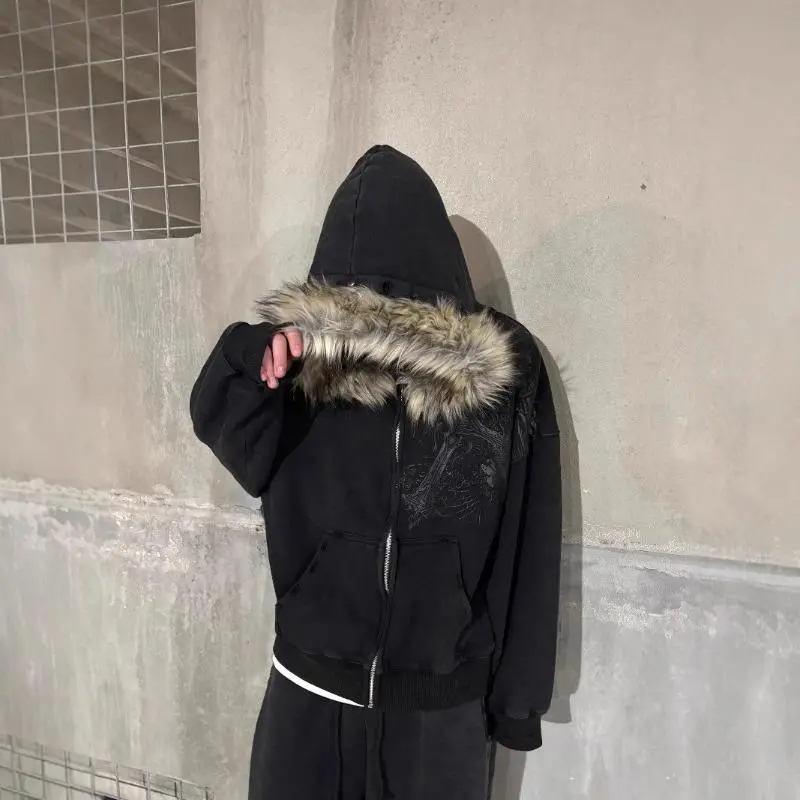 The perfect Christmas gift Black zip-up hooded jacket with faux fur - unisex street gothic style Coats Menswear Tops Beige Casual Long Sleeve Plain snowboarding outfit