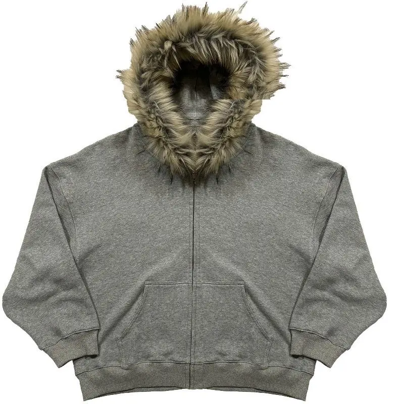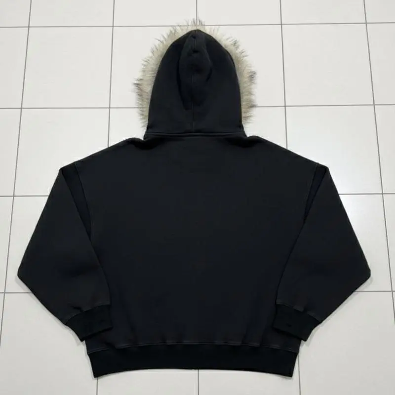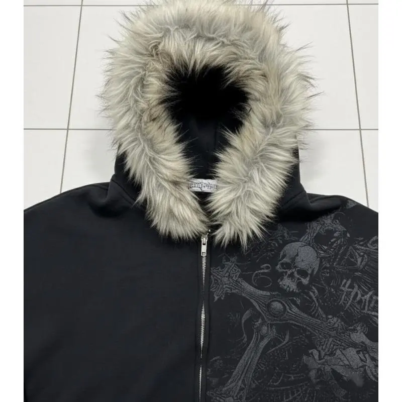 General description: Embrace bold style with this black zip-up hooded jacket, featuring a faux fur collar for a stylish and unique touch. Perfect for a street/gothic/alternative look, this unisex piece pairs just as well with black jeans as it does with more daring outfits. General description: Embrace bold style with this black zip-up hooded jacket, featuring a faux fur collar for a stylish and unique touch. Perfect for a street/gothic/alternative look, this unisex piece pairs just as well with black jeans as it does with more daring outfits. Features : Color: deep black Closure: central zip Hood: integrated Fur: synthetic, imitation fur, natural color Pockets: two front pockets Sleeves: long with ribbed cuffs Fit: slightly oversized / straight Material: cotton / polyester / fleece