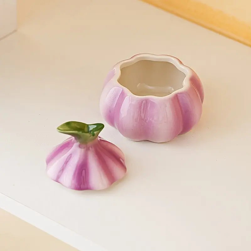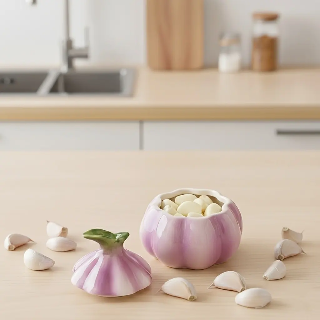 【Unique Shape】: Garlic-shaped ceramic canister adds a fun and functional touch to your kitchen storage.