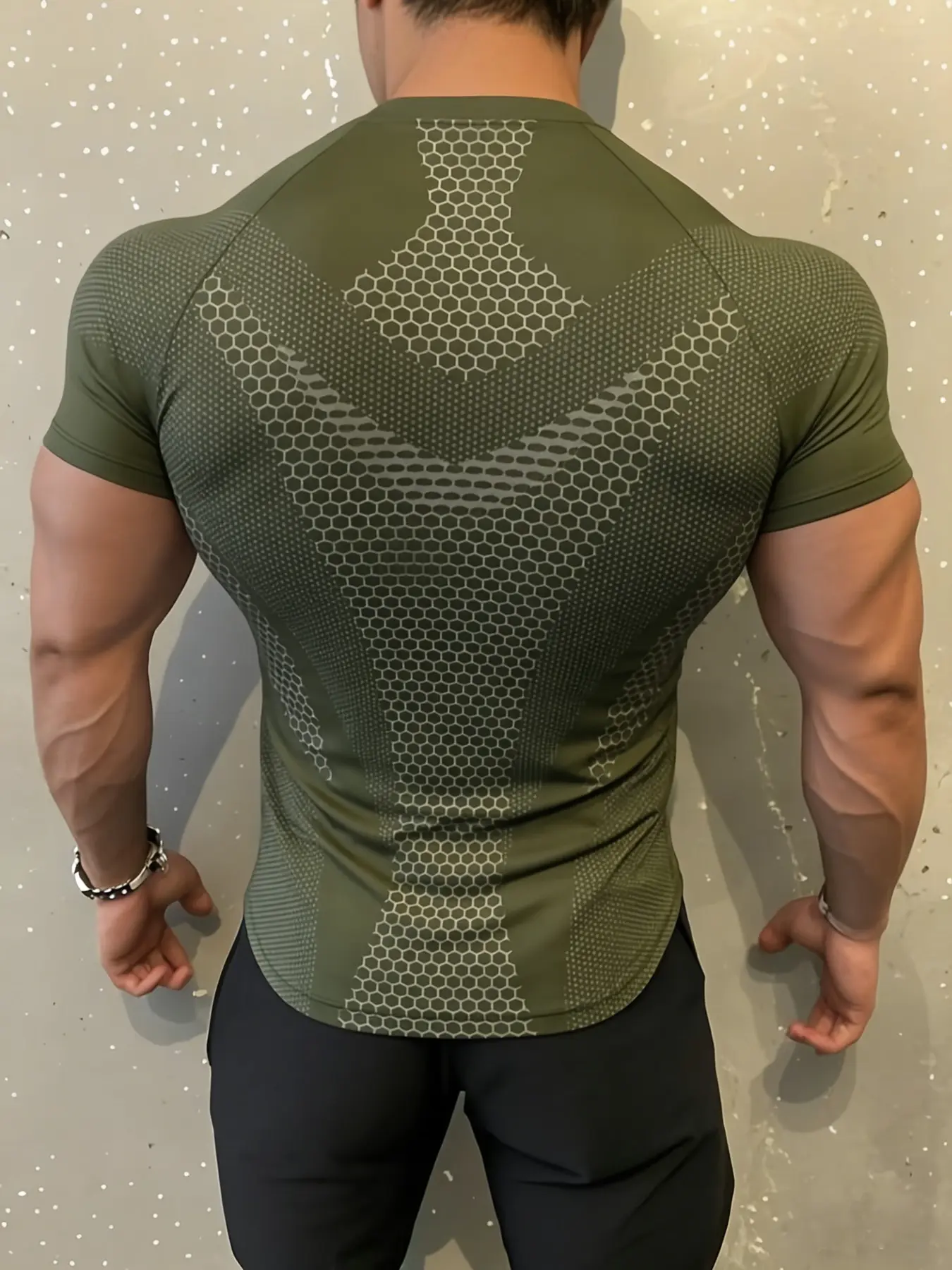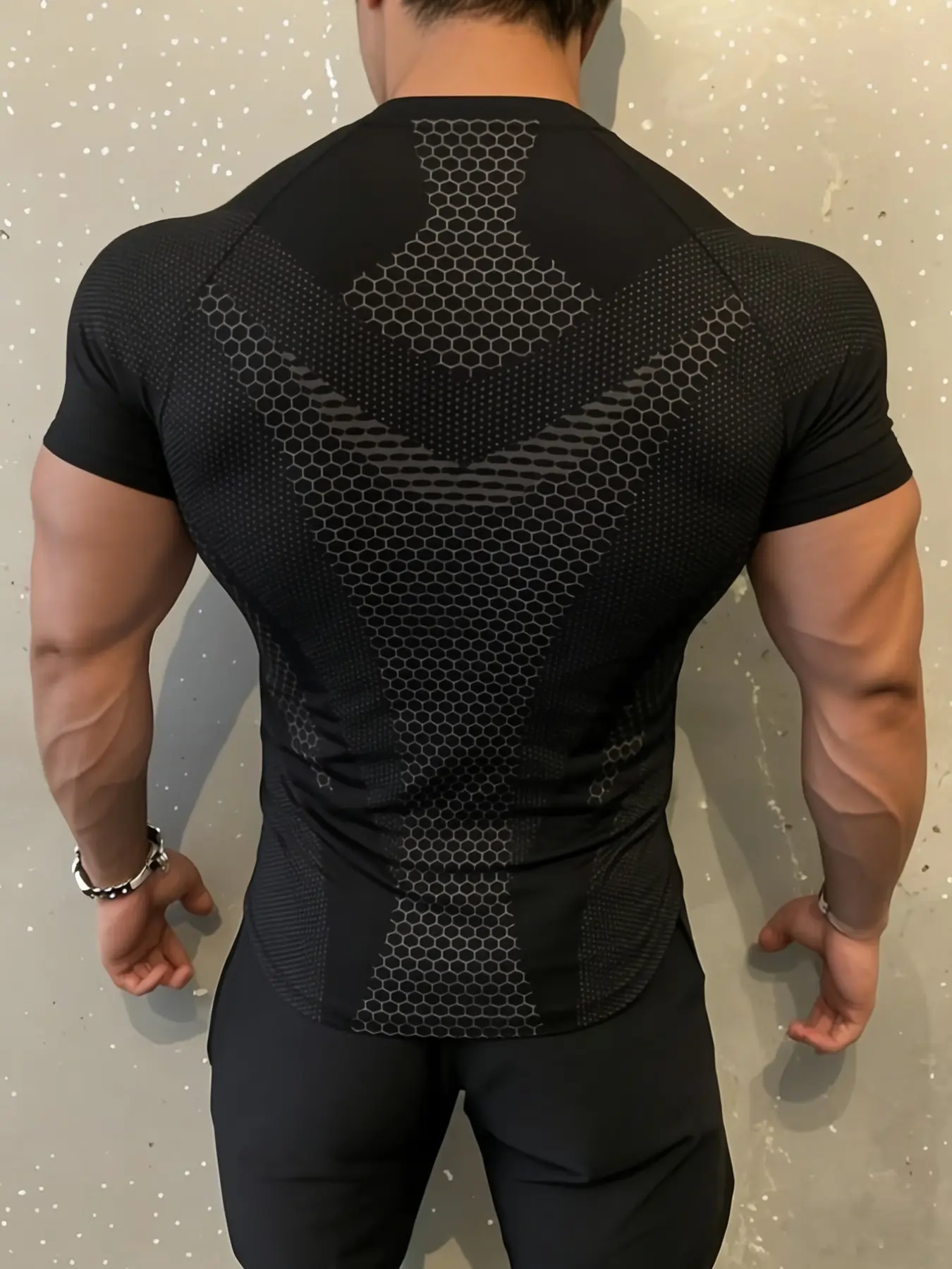 Men's Honeycomb Patchwork Quick-Dry Tight-Fit Shirt, Moisture-Wicking, Breathable, Gym Training Muscle-Defining T-Shirt, All Seasons