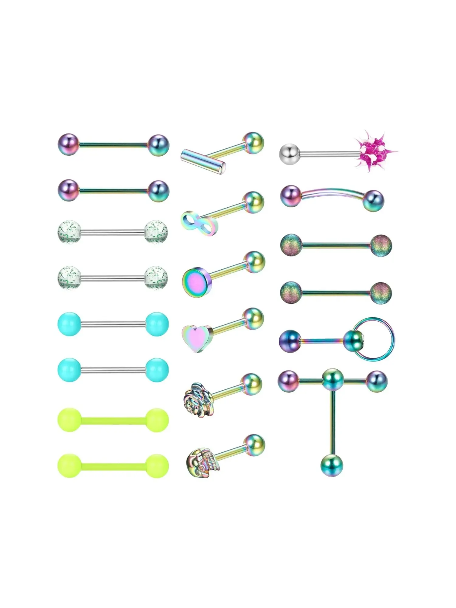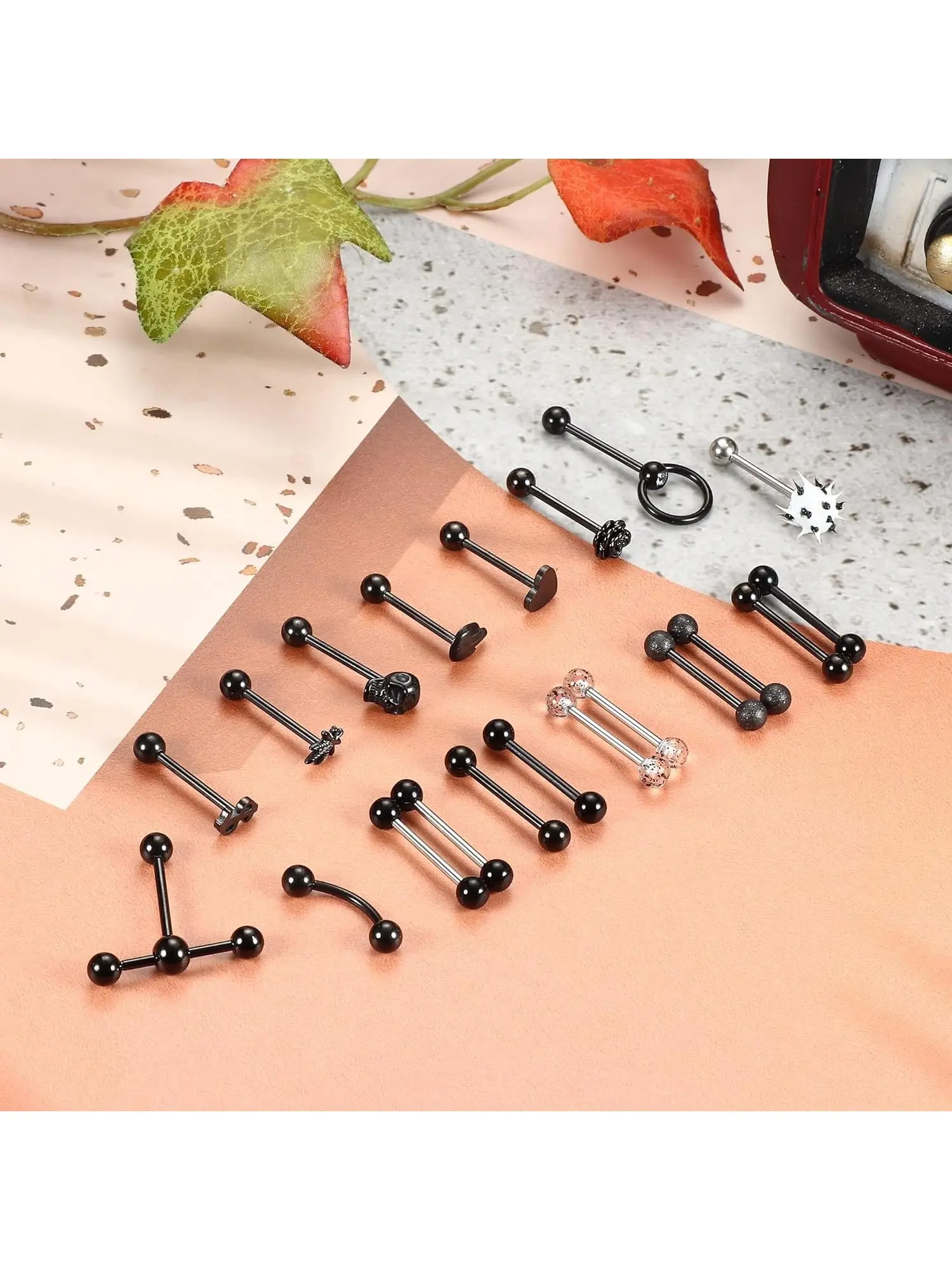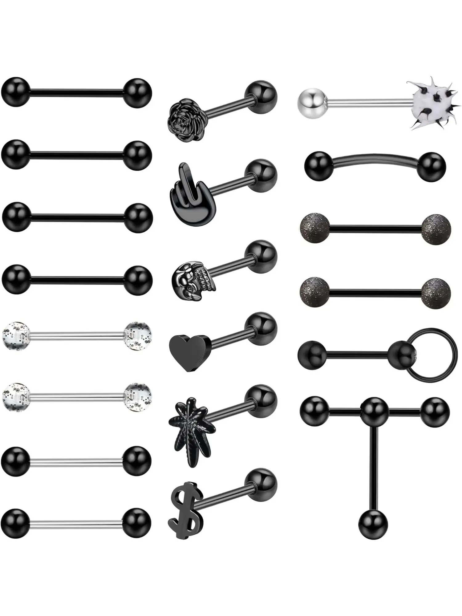 20Pcs 14G Tongue Rings for Women Men 316L Stainless Steel Skull Heart Tongue Piercing Jewelry