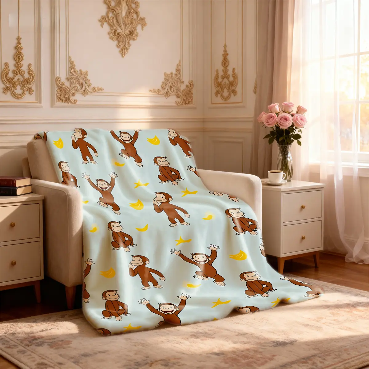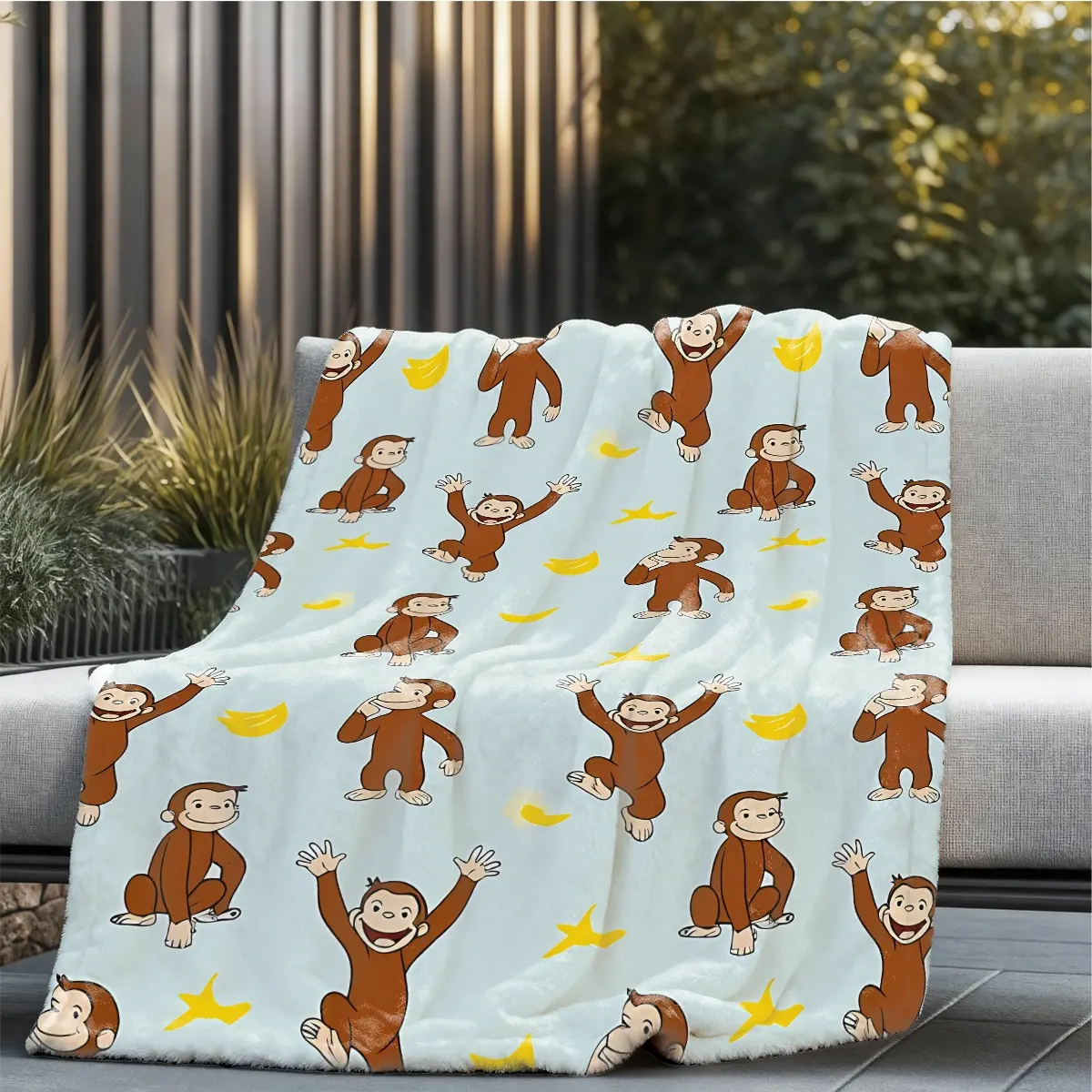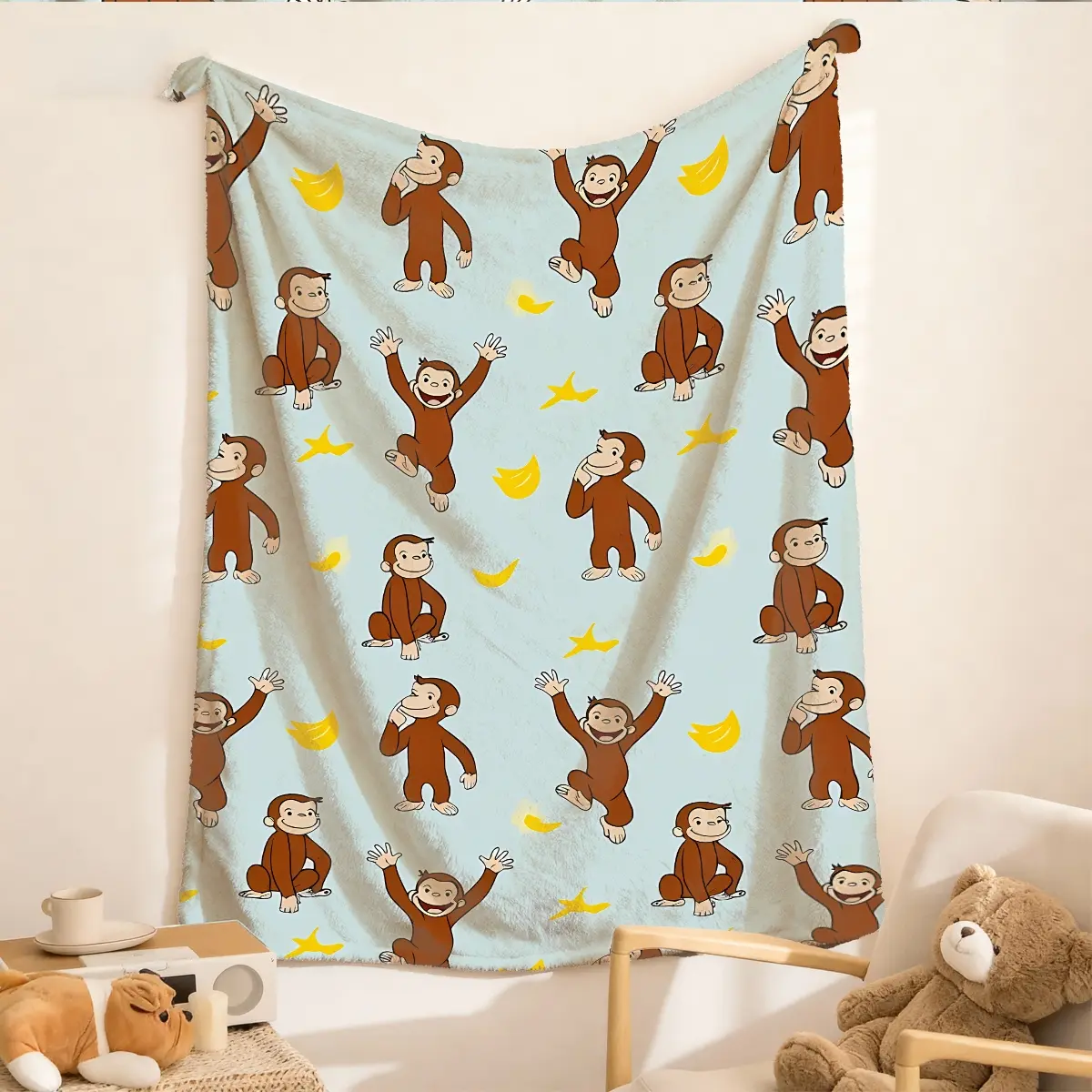Curious George Monkey Banana Theme Flannel Printed Blanket, Large Size, Soft Lightweight Warm, Perfect for Bed Sofa Office Camping Travel, Warm Nap Blanket
