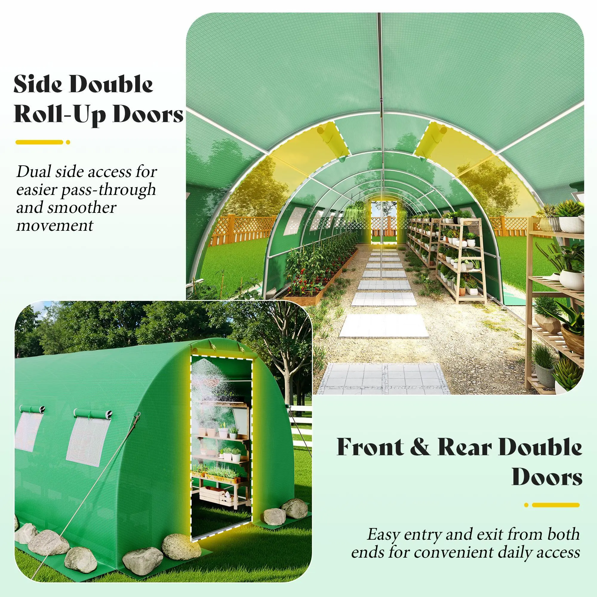 ·360° Airflow Design: Front and rear double doors plus dual side roll-up doors with mesh windows ensure cross-ventilation. This walk in greenhouse keeps airflow steady, pests out, and humidity balanced for healthy growth