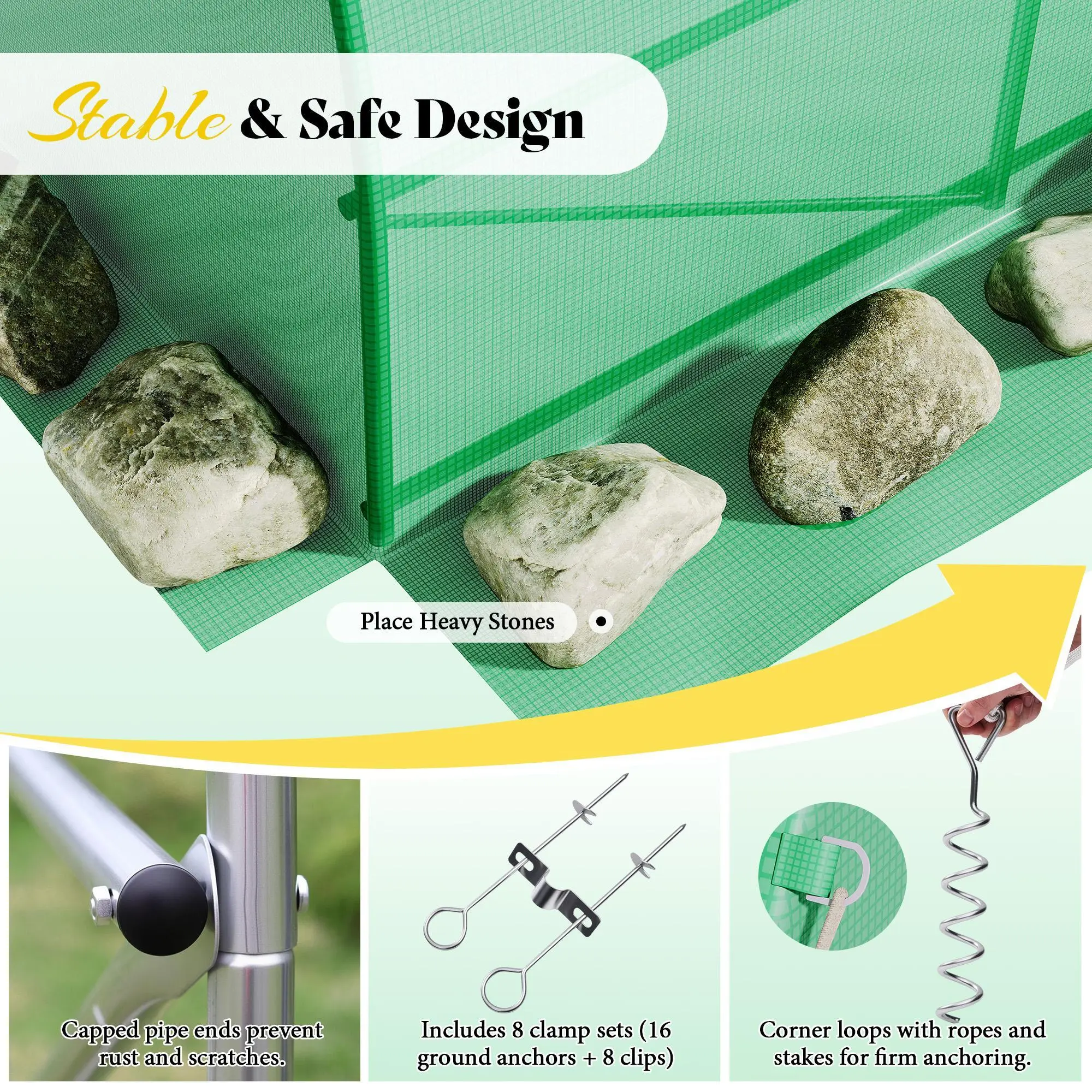 ·Secure & Stable Design: Spiral stakes, ropes, and clamps provide firm anchoring. The 30cm widened edges boost wind resistance, while capped pipe ends prevent rust—keeping this greenhouse kit stable and safe over time