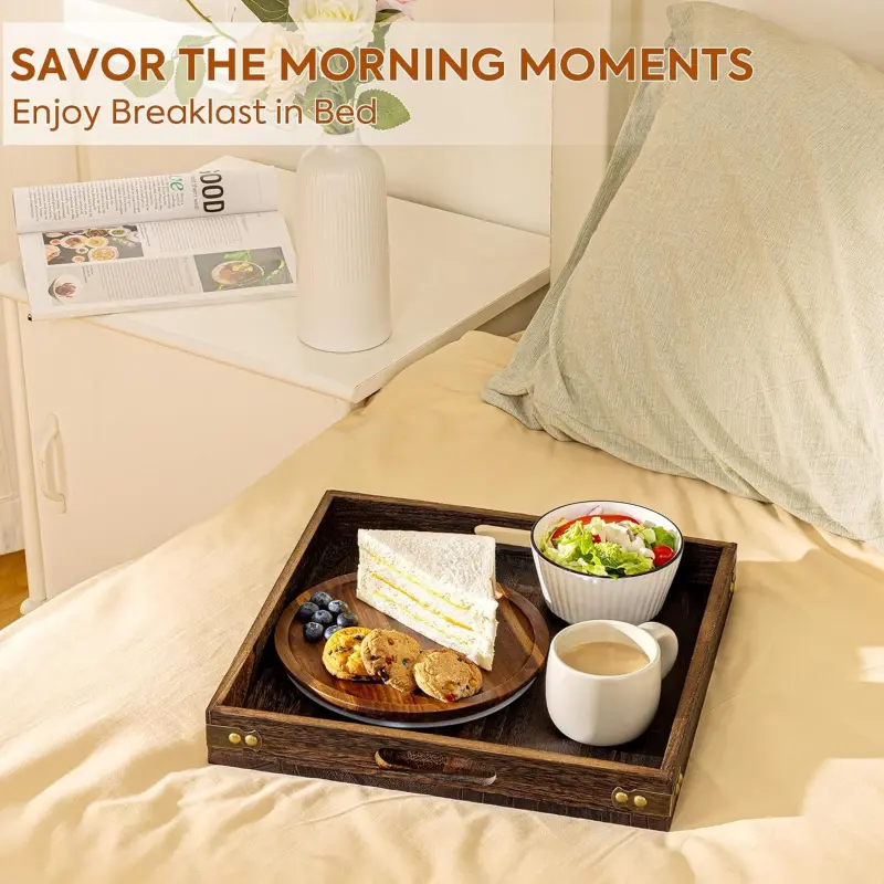Serving Tray with Handles,13"*13"Wood Decorative Tray for Living Room,Modern Coffee Table Tray,Square Large Serving Platters for Home Decor,Ottoman,Bed,Kitchen,Bathroom, Breakfast,Bar