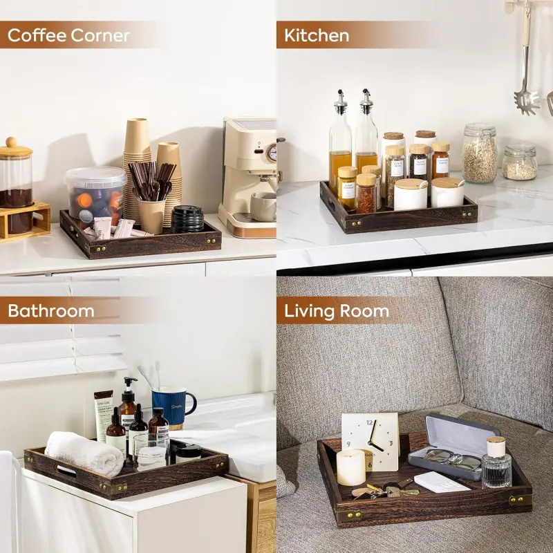 [Paulownia Wood Serving Trays]Serving tray made of High-quality wooden,premium wood edges articulate tightly , and rivets all round, reducing the risk of cracking by 90% compared to solid wood ones, everyday heavy-duty use in the kitchen and commercial environments. [Square Tray with Handles]The decorative coffee table tray is equipped with two built-in hollow handles and elegant sides, which canprevent items from falling, also easily carry the square decorative tray wherever you need it. [Large Serving Trays]The size of the square serving tray is 12.5" x 12.5" x 1.77",which is perfect for placing the remote control, magazines, sunglasses, wallets, etc. To keep things organized and easy to retrieve. tray is large and versatile to handle any task.The surface of the tray is smooth and easy to wipe with a damp cloth or rinse with warm water. [Decorative Tray]The wood tray decorative perfectly combines style and function, which can provides services and decorations for the living room, bedroom, bathroom or entrance, ect. In addition to daily use, the decorative plastic tray is also a reliable helper for birthdays, parties, weddings and other special occasions. [Multifunctional Serving Tray]This patio serving tray is ideal for serving breakfast, lunch, dinner, snacks and any meal. The square tray can also be used as a jewelry tray, makeup tray, Ottoman tray, coffee table tray, desktop organizer or unique gift ideas. Our ottoman tray will make your life easier and more convenient.