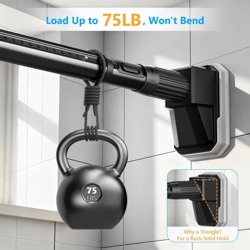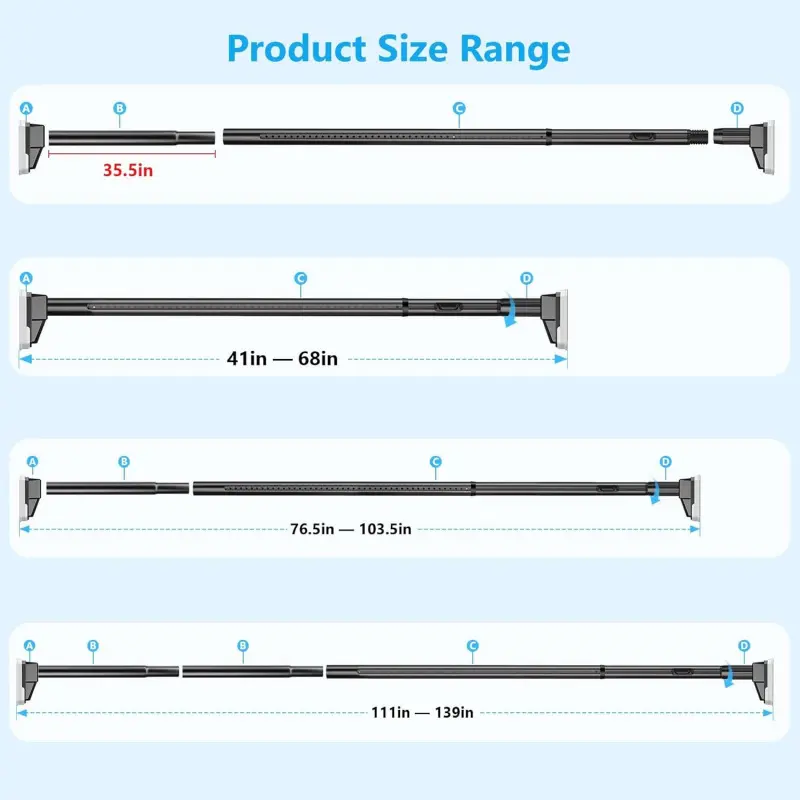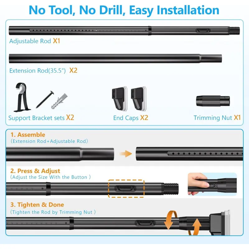 Effortlessly Adjusts in Seconds: tension curtain rod features a 1-click adjustment through the upgraded internal locking design, compared to traditional ways the adjustment is more convenient and faster, easier installation 75LB Heavy-Duty Support: Made from sturdy and durable carbon steel, these curtain rods for windows won't bend up to 75LB loaded; Multi-layer water and rust proof coating offers a longer lifespan, 1. 29-inch rod diameter fits most curtain hooks and curtain holes Upgrade Non-Slip End Pad: Triangular structure end provides more stability for this tension rod, larger rubber non-slip soft pad grips firmly to the wall, won't fall with hanging heavy curtains, clothes, decorations, or other heavy items No-Drill & Easy Installation: Installing this shower rod only requires three steps: 1. Assemble, 2. Adjust, 3. Tighten, no tools and drilling needed, ideal for both homeowners and renters, compatible with tile, painting, drywall, glass, and wood, etc. Suitable for Multi-Sinarios: This multifunctional shower curtain rod range 41"-139"(1. 29-inch rod diameter) is ideal for both indoor and outdoor applications, suitable for bathrooms, windows, bedrooms, living room, room divider, patios, pergolas, hanging decoration, among other locations