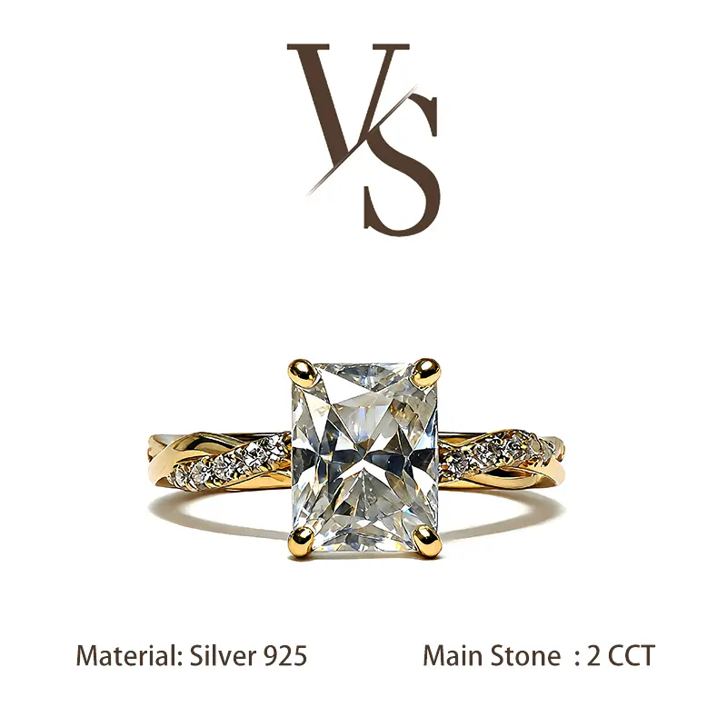 [Venus Jewelry] Synthetic Moissanite 2 CCT Radiant Cut Double Twist Band Design VVS 1 D Color Solid Silver 925 Solitare Ring