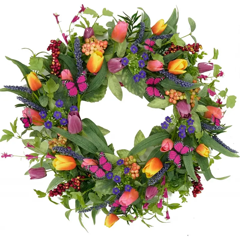 [Unique Design spring summer wreath]: We use unique three-dimensional high quality solid filled tulip flower heads. It has big tulip flower heads full of three-dimensional. Please adjust or bend the branches on the spring wreath and arrange the tulip flower heads upward for best display. This Spring front door wreath is decorated with a full circle of lifelike colorful tulip, Many kinds of leaves and Purple tassels, eucalyptus leaves, ferns, butterflies creates a romantic look that makes for a wonderful style for spring door decoration. Elegant and vivid colors make for timeless seasonal home décor [Best Friends for spring summer wreath]- Suitable for spring, wedding, home, wall, window, front door, fireplace, living room, bedroom, dining room, fireplace, porch, window and other indoor and outdoor decoration. Add glamour to your spring and summer season with this striking tulip wreath. [Multi-occasions]: The spring summer tulip wreath can be used indoor or outdoor, place it on your front door, or hang it above your fireplace. It's also perfect for decorating weddings, birthdays, stages, bedrooms, offices, dining rooms, and others [Easy Maintenance]: Highly realistic handmade artificial wreath makes it durable and requires no special maintenance. Just wipe it with a wet tissue or towel to keep it neat [Packaging Design] - we pack the wreath to gift box and we Tighten the wreath when packing so that the wreath can be protected when delivery,pls open,fluff the wreath and adjust the branches and flowers,the maximum size of wreath can be 22".