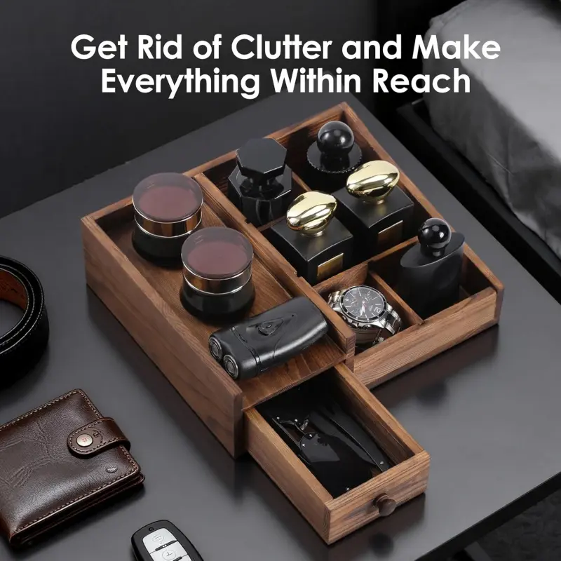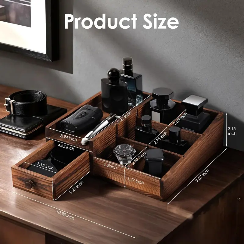 [HIGH-QUALITY MATERIALS]Mens cologne organizer is meticulously hand-carved from 100% natural solid wood, showcasing unique grain patterns that add a touch of nature’s artistry to your space. No assembly needed-ready to use right out of the box. [Great Design]Organizer for men has 6 spacious and adjustable compartments, and the layout is customized to suit your item perfectly. Extra ultra-deep drawers provide safe storage space for precious or rarely used items. [MULTI FUNCTIONAL ORGANIZER]Bathroom organizers seamlessly blends elegance with practicality, designed to neatly store and display all your grooming essentials. Perfect for perfumes, skincare, cosmetics, razors, cotton swabs, and more-keeping your bathroom counter or vanity tidy and clutter-free. [No More Clutter]Eliminate clutter with unified storage for cologne, skincare, and accessories, featuring reinforced construction that resists warping and prevents tipping for lasting durability. [The Perfect Gift for Men]An ideal surprise for husbands, dads, sons, boyfriends, brothers, friends, coworkers, or bosses. Great for Christmas, birthdays, Father’s Day, anniversaries, graduations, and special occasions. Thoughtful, practical, and stylish-a gift he’ll actually use every day!