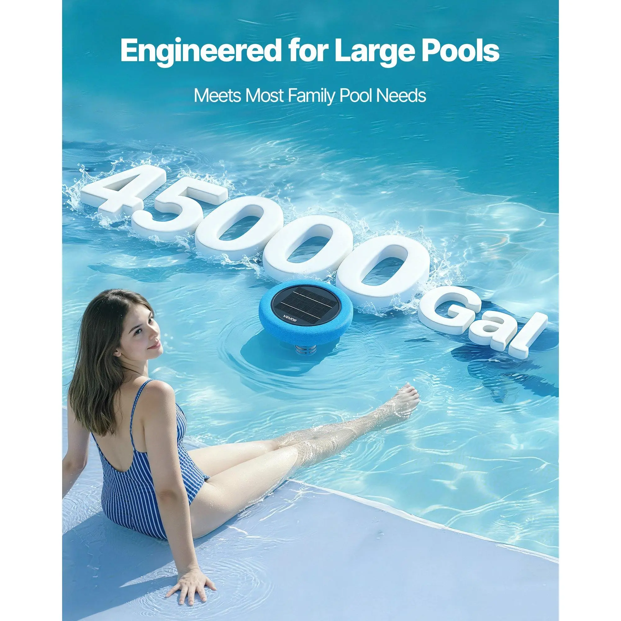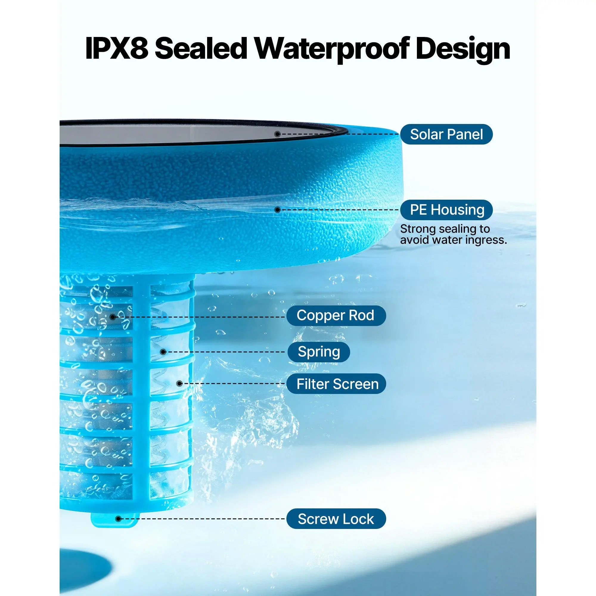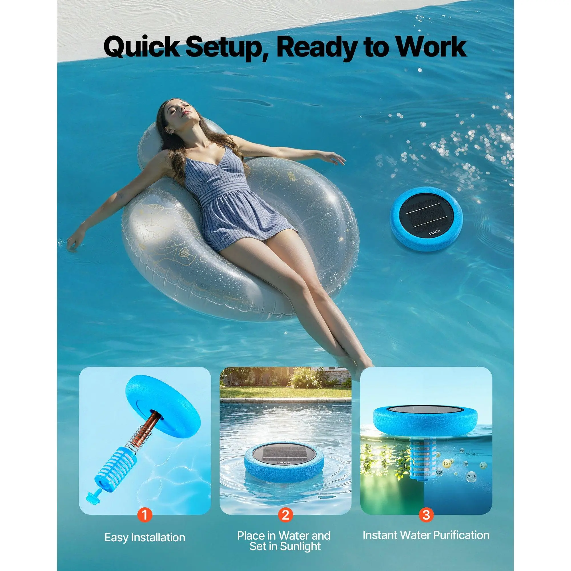 Effective Pool Maintenance: This solar pool ionizer treats up to 45,000 gallons of water.Powered by solar energy, it continuously releases copper ions to help control green growth, reducing the use of additional pool treatments and related costsReliable Swimming Condition: This pool copper ionizer provides a reliable purification system and test strips.It helps keep water balanced within a 7.2-7.6 pH range, avoiding eye irritation, dry skin, and hair damage caused by poor water qualityDurable & Leak-Proof: Built for long-lasting, efficient performance, our pool ionizer features a thick and crack-resistant PE housing, with reinforced seals at key points for an IPX8 waterproof rating.Its copper rod ensures corrosion resistanceEasy to Use: Simply place the copper ionizer for pool in the water and let it float to run on solar power.Ideal for in-ground and above-ground pools, saltwater, outdoor spas, and chlorine pools, it is compatible with all pool surfacesComplete Kit: Everything you need is included: the main unit, copper rod, copper cleaning brush, spring, screws, filter screen, and a user manual.Our solar copper pool ionizer provides 50 6-in-1 test strips to monitor water balance and copper ion levelsVEVOR Solar Pool Ionizer, Round Copper Pool Ionizer Up to 45000 Gal, Floating Automatic Water Cleaner and Purifier, Chlorine Free Water, with Copper Anode, Spring, Brush and Filter for Pools & Spas