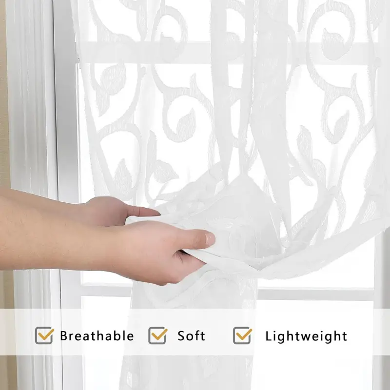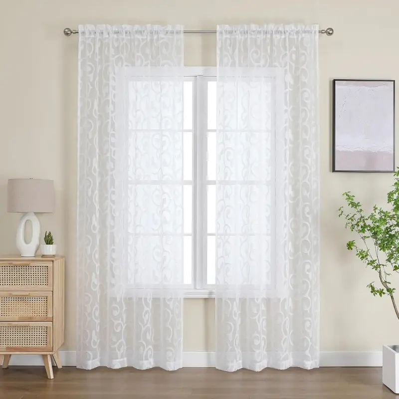 Sold as 2 Panels: Each package includes 2 pieces jacquard sheer curtains with pattern. Each panel measures 40 inch width, 84 inch long( The curtain length not include top 1.5 inch header) 2 pieces total width is 80 inches, Sheer curtains width is 1.5-2 times wider than your window to show a nice look. Multiple Length are available, please measure your window first for the right choose. [Light Filtering Sheer Curtains]:Crafted from a high-quality polyester fabric with elegance jacquard pattern, soft and elegant. Their textured design filters light, offering the perfect balance of privacy while still flooding the room with ample natural light. They effectively block out a portion of the intense sunshine and UV rays, fostering a serene environment where you can bask in the warm, natural light throughout the seasons. [Luxury Clip Texture Sheer]: The semi-sheer curtains are crafted from a luxurious solid-colored 100% polyester fabric. Featuring a unique clipped craftsmanship, these curtains boast exquisite geometric jacquard burnout designs that lend a vibrant, textured, and three-dimensional appeal. They are breathable, soft, and natural, adding visual intrigue to any window dressing. Our luxurious sheer panels transform your home into a new and elegant sanctuary. [Widely Use]: These sheer Curtains with top dual rod pockets design, 2" rod pocket makes this sheer curtain easier to hang or slide and fit most of curtain rods( Up to 1"). The farmhouse sheer curtains are suitable for various settings, whether it's the living room, bedroom, guest, dinning, nursery room or study. They add a touch of elegance and serenity to your space, enhancing the quality of your home life. [Easy Care]: Good quality finishing will withstand years of use for sheer curtains. Machine wash cold in gentle cycle with like colors. Only non-chlorine bleach when needed. Tumble dry low. Cool iron as needed.