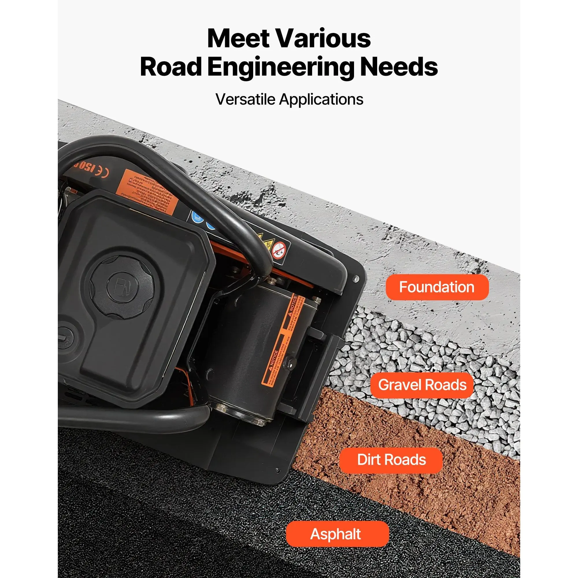 Effortless Operation: Equipped with a non-slip handle, this plate compactor stops sweaty palms from slipping even in hot weatherMighty Power: This compactor machine's 6.5 HP horsepower can compact 4507–6791 ft² of ground in 1 hour, and 10.5 kN compaction force combined with 82 ft/min travel speed can efficiently complete work tasksDurable Construction: This professional compactor's engine can reach a speed of 5600 RPM, helping you compact the ground quickly.The thick compaction plate can last for a long time.EPA-certified, ensuring low gas emissions for a cleaner atmosphereLarge Capacity Fuel Tank: This gas powered compactor features a 0.5 L oil capacity and a 2.5 L fuel tank, use 95 octane gasoline.Simply refuel and start working.For engine protection, continuous operation is recommended for up to about 40 minutesSuitable for Various Roads: This vibrating plate compactor can be widely applied in construction, municipal administration, highways, railways, and other fields to fulfill the road surface tamping of dirt, gravel, lawn, and so onVEVOR Plate Compactor, 6.5 HP 196CC Gas Engine, 5600 VPM Vibrating Ground Rammer, 2360 lbs Compaction Force, 20.1 x 15 in Plate, Walk Behind Compactor for Paver Landscaping, Asphalt, Foundation, Soil