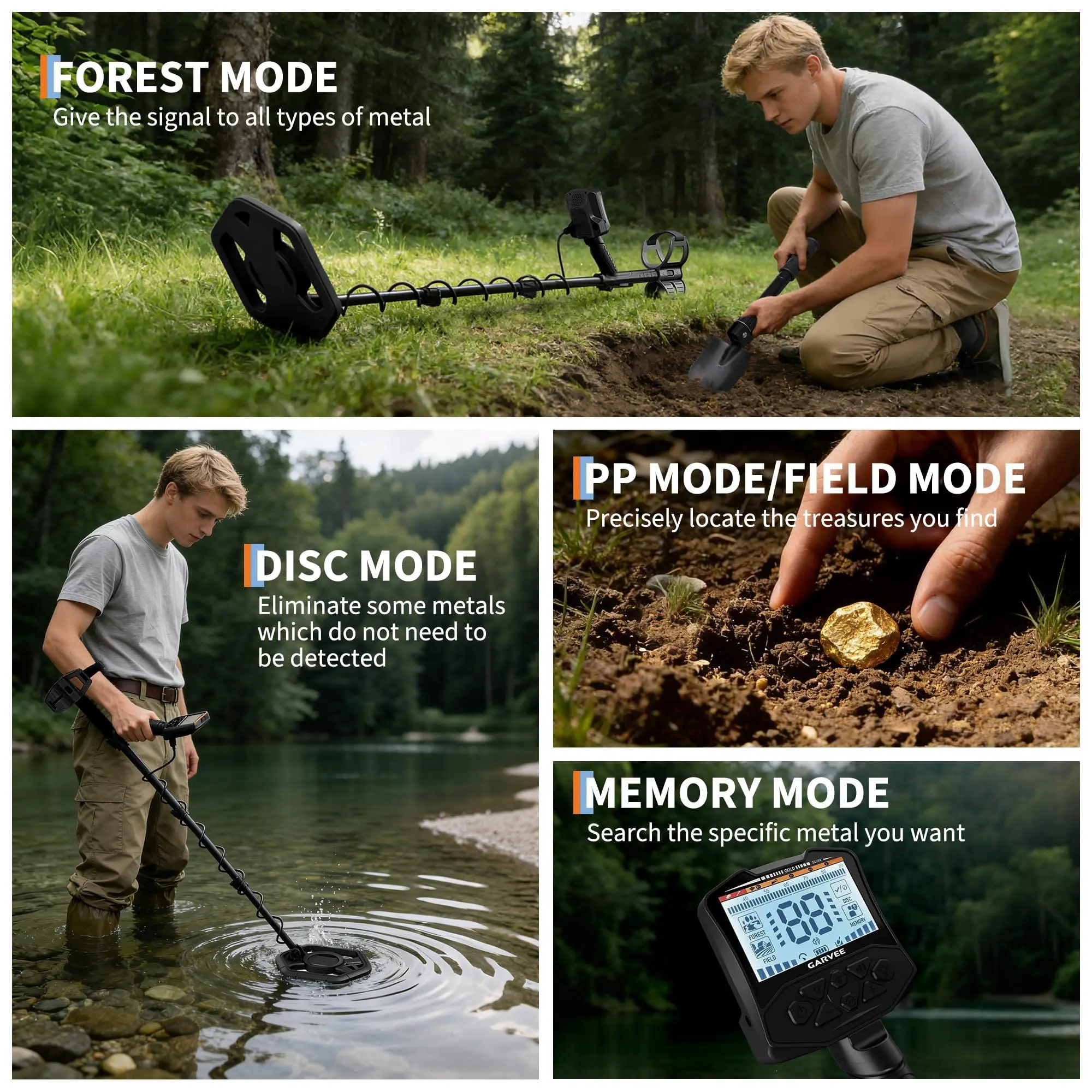 ⚙️【Versatile Detection Modes for Smarter Searching】Equipped with 4 motion modes (All Metal/Forest, DISC, Memory, Field) plus an accurate Pinpoint function, this metal detector allows you to detect various metals or ignore unwanted items like iron, making it ideal for gold hunting, coin shooting, and outdoor exploration.
