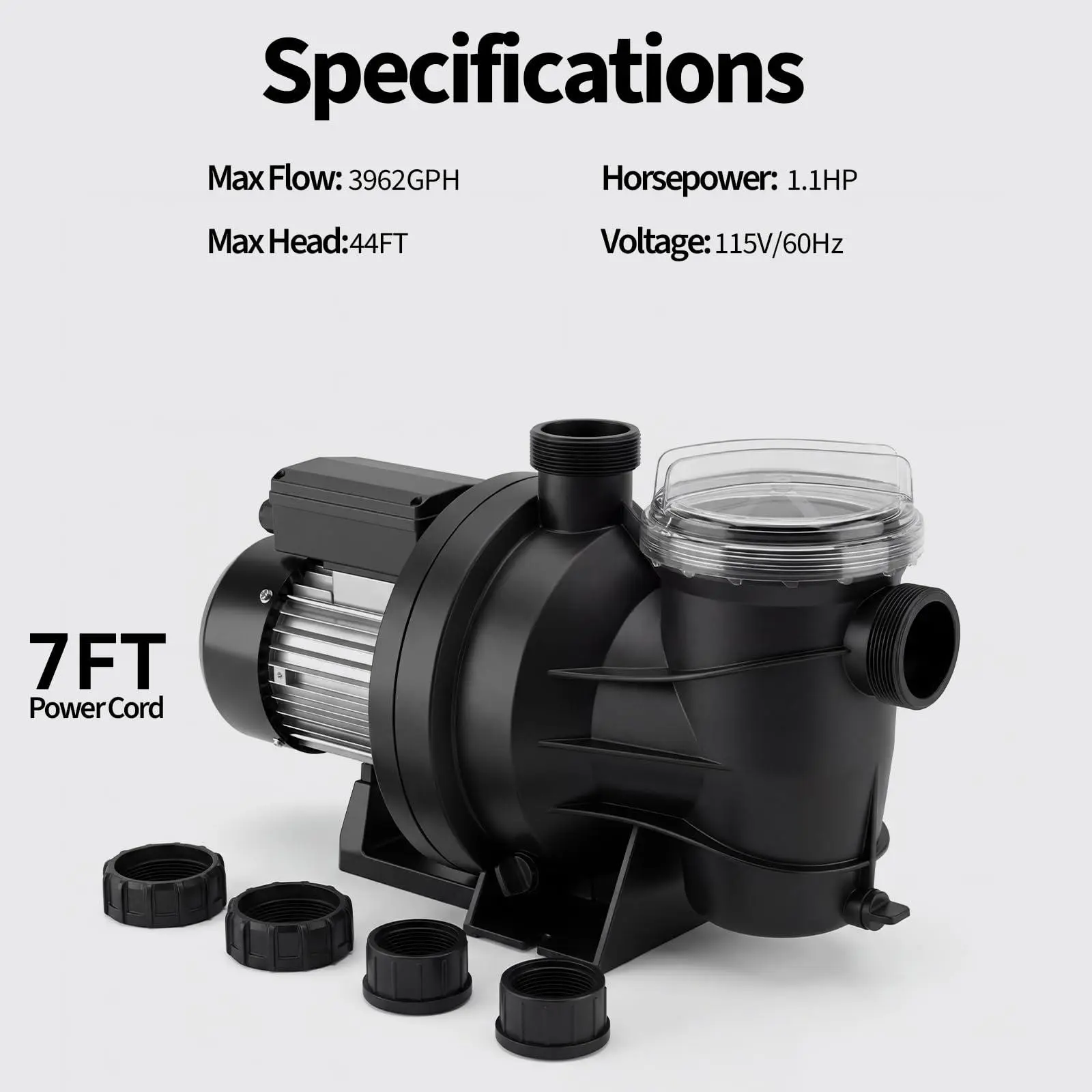 Powerful Performance: Experience unmatched pool water circulation with our 1.1HP pool pump. With a maximum flow rate of 3962 GPH and a 44 ft maximum head, it ensures crystal-clear water in your above ground or inground pool.