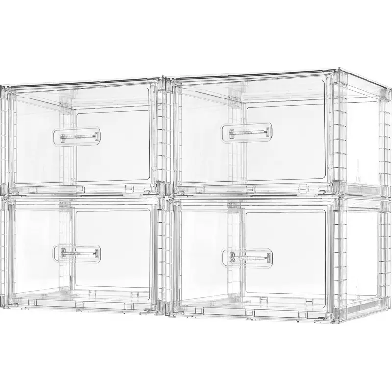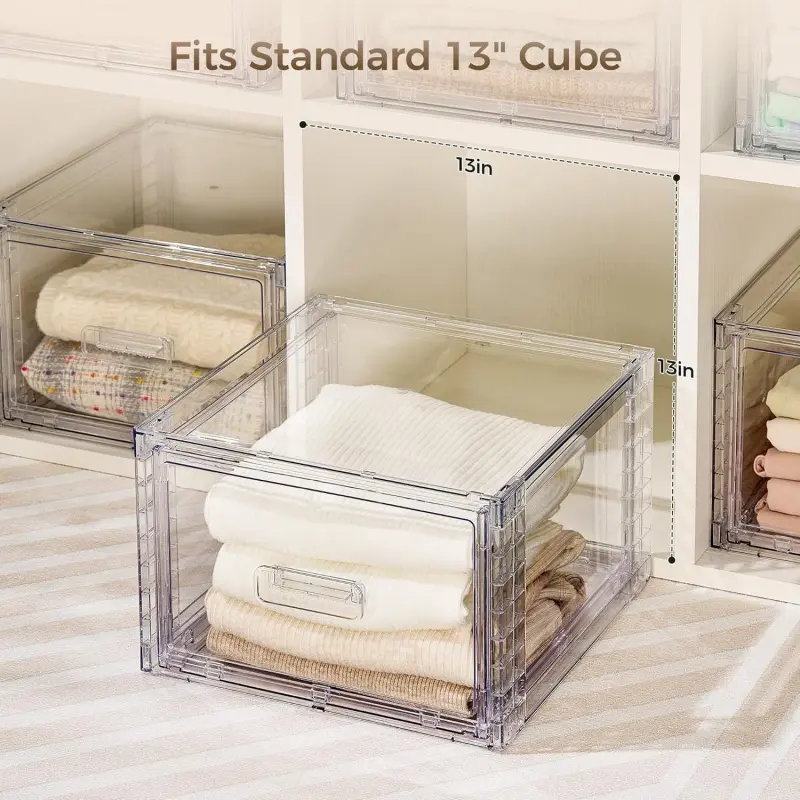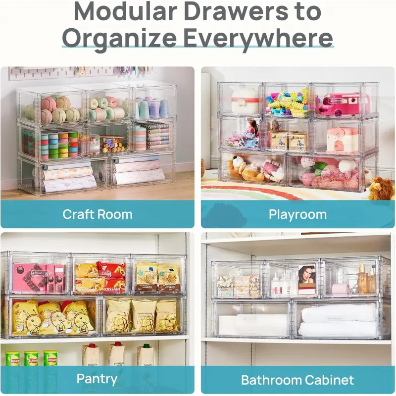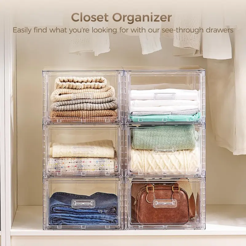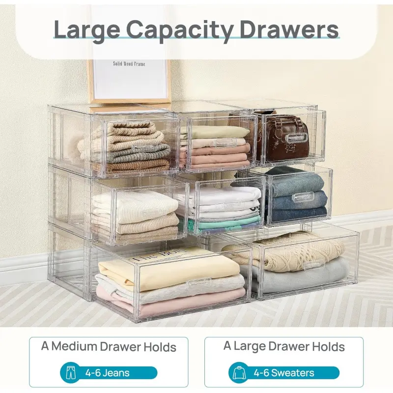 [Space Saving]The plastic storage drawers save space without taking up too much floor area. Designed to maximize storage under the walk-in closet, they feature smooth-glide drawers for easy access, allowing you to effortlessly slide them in and out. Perfect for organizing clothing, bedding, and out-of-season essentials. [Large Capacity]Each acrylic storage bins measures 12 x 12 x 8 inches (front width x depth x height) and holds up to 18 quarts. These plastic storage bins are built to fit just about anything you can think of, from clothes and bedding to snacks, medicine, cleaning supplies and all those random odds and ends. [Stackable Design]The stackable drawers allow you to customize storage in any space by combining varying numbers of units - perfect for closet,bathroom,kitchen pantries,medicine cabinets or under-sink organization. [Clear View]Made from durable, crystal-clear PP material, the transparent drawer design provides instant visibility of contents-no more rummaging through storage. The scratch-resistant surface ensures long-lasting clarity while maintaining a sleek, modern aesthetic in any space. [Easy Assembly]The storage drawers can be fully assembled in just a few minutes. First, set up the outer frame, then install the drawer,then sliding it along the track into the frame - and have done!
