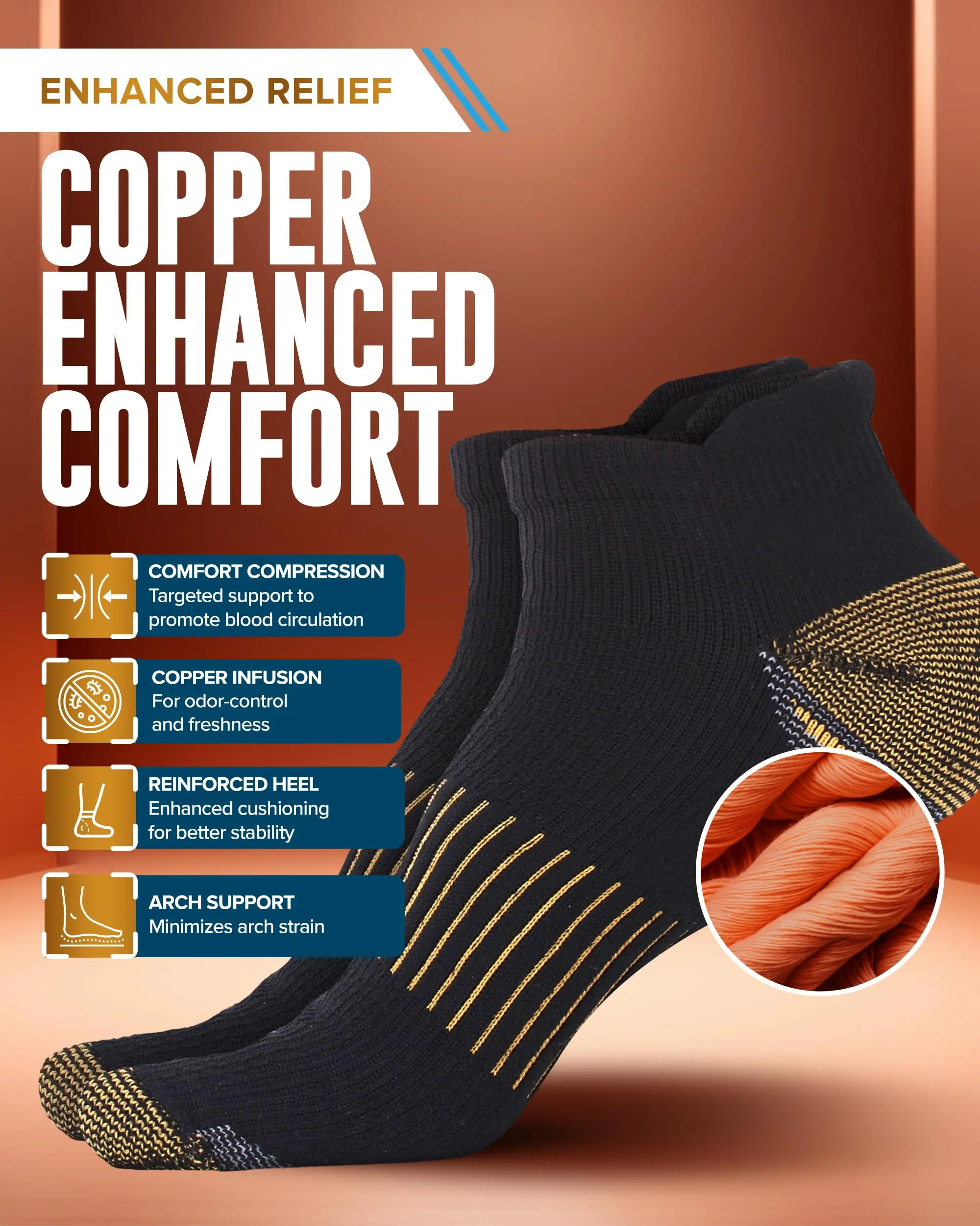 Rediscover Foot Comfort - Experience soothing relief with copper plantar fasciitis relief socks. Designed with comfort compression, they enhance circulation and help in easing foot discomfort.
