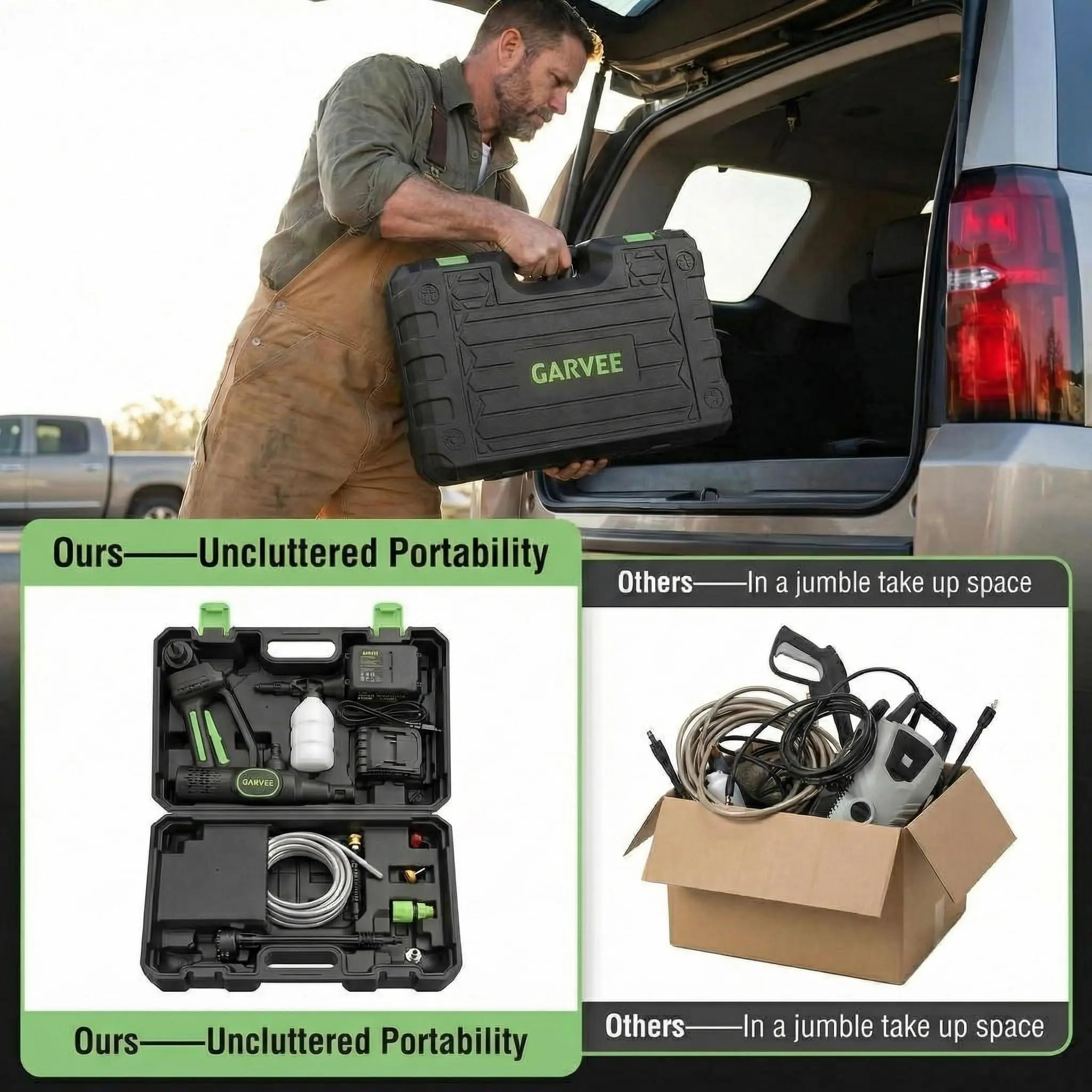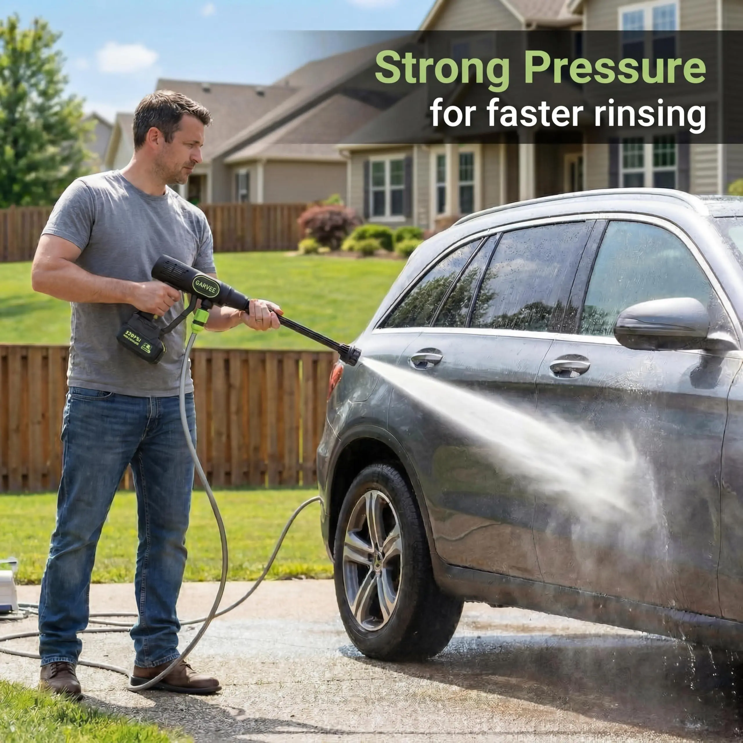 【Powerful & Efficient Cleaning Performance】This cordless pressure washer delivers strong cleaning performance combined with a high 2.5 GPM flow rate, enabling you to rinse away dirt faster and more efficiently than standard models. The balanced pressure is powerful enough for tough jobs on patios and driveways, yet gentle enough for cleaning your car and outdoor furniture without causing damage.