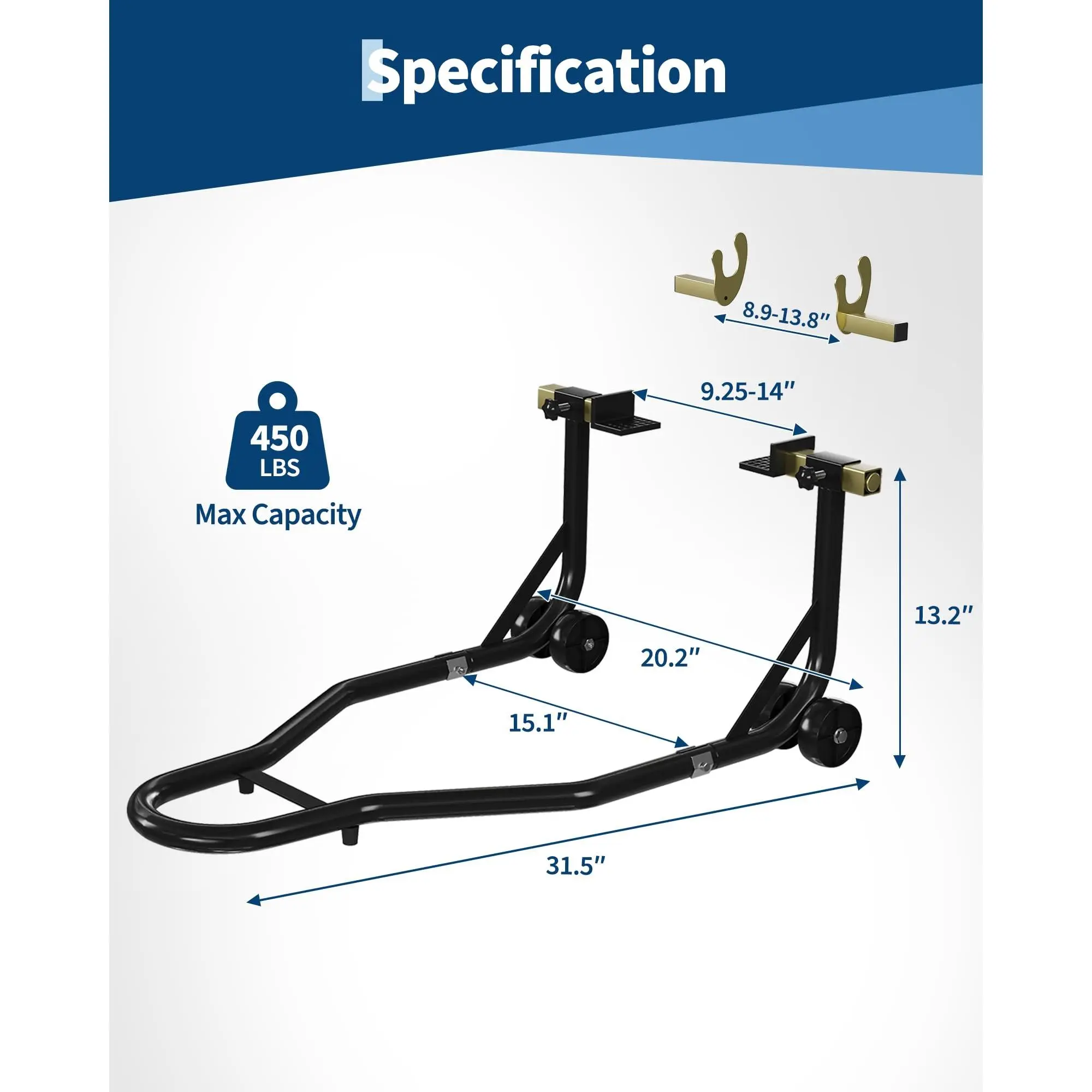 ADJUSTABLE FORKHEADS: The interchangeable front and rear stays provide versatile fitment, with U-shaped front supports (8.9–13.8-inch adjustment range) and L-shaped rear supports (9.1–13-inch range). Designed to accommodate most motorcycle models on the market.