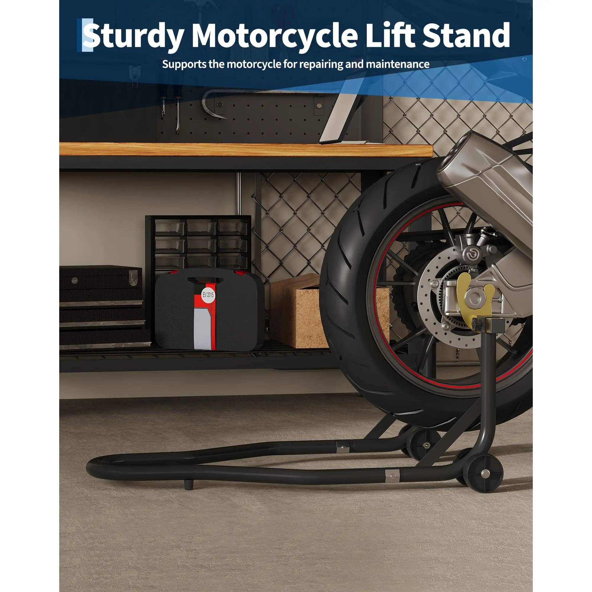 MULTIPLE APPLICATIONS: This stand is ideal for a wide range of scenarios, both at home and in professional repair shops. It provides support for numerous tasks, including vehicle storage, tire changes, maintenance, and part installation. It is also perfect for detailed jobs such as chain lubrication, oil changes, and general cleaning.