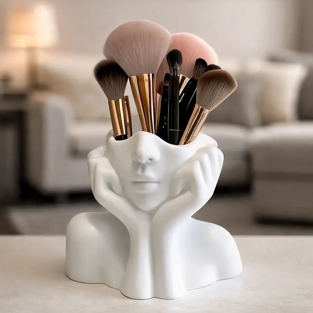 A Cute Makeup Brush Storage Box Shaped Like a Human Face • Featuring a Minimalist White Design That Captures The Relaxed Vibe of a Resting Face • This Artistic Piece for Your Desk Combines Practicality with Aesthetic Appeal