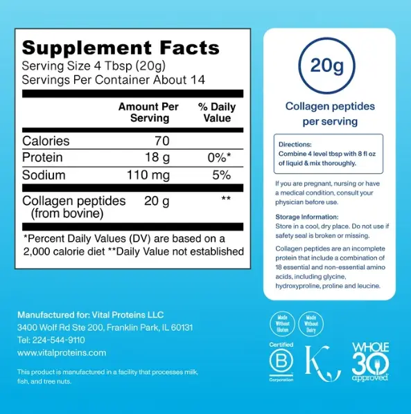 Vital Proteins Collagen Peptides Powder is a convenient addition to your daily routine. This unflavored powder dissolves easily in both hot and cold beverages, making it ideal for coffee, smoothies, or cooking. Designed for everyday use with a simple ingredient profile and easy mixing.