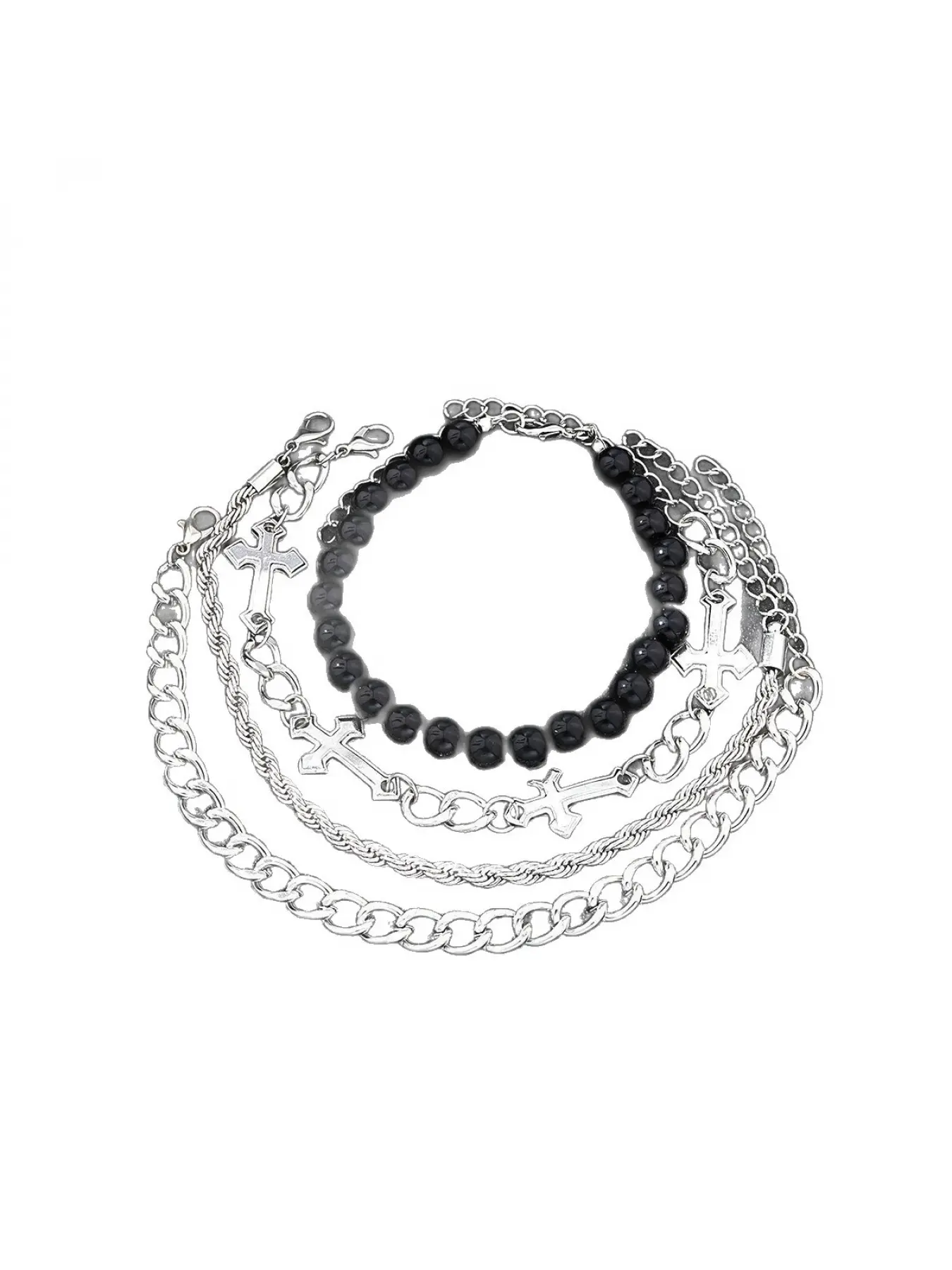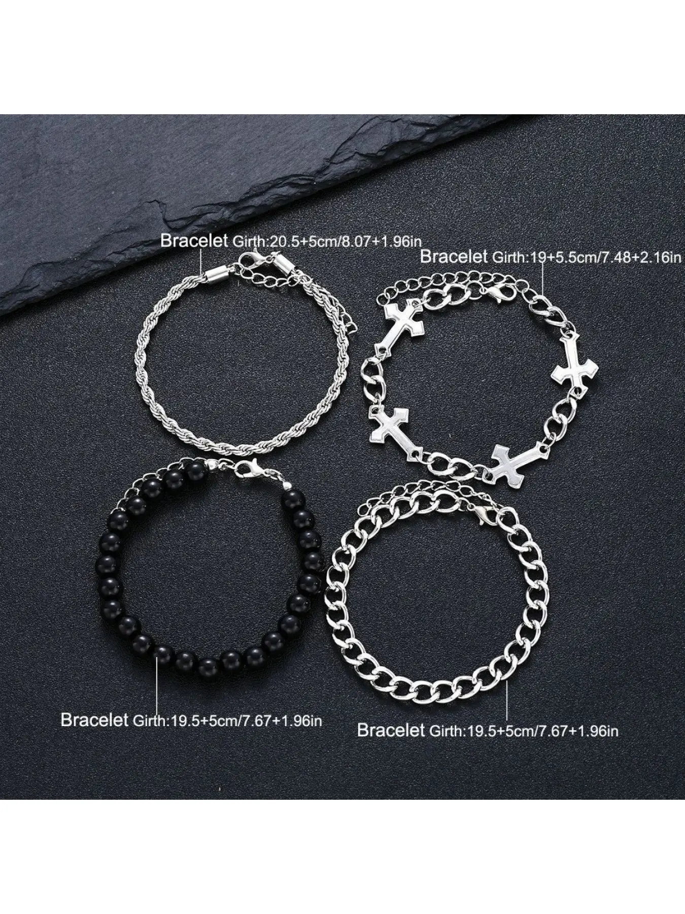 Stylish Dark Series Cross Charm Bead Bracelets 4 Packs Minimalist Layering Bracelet Set Premium Stainless Steel Unisex Holiday Gift Idea