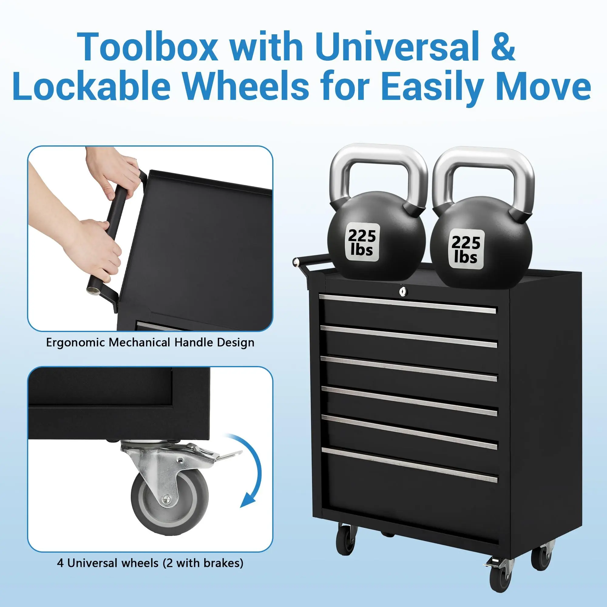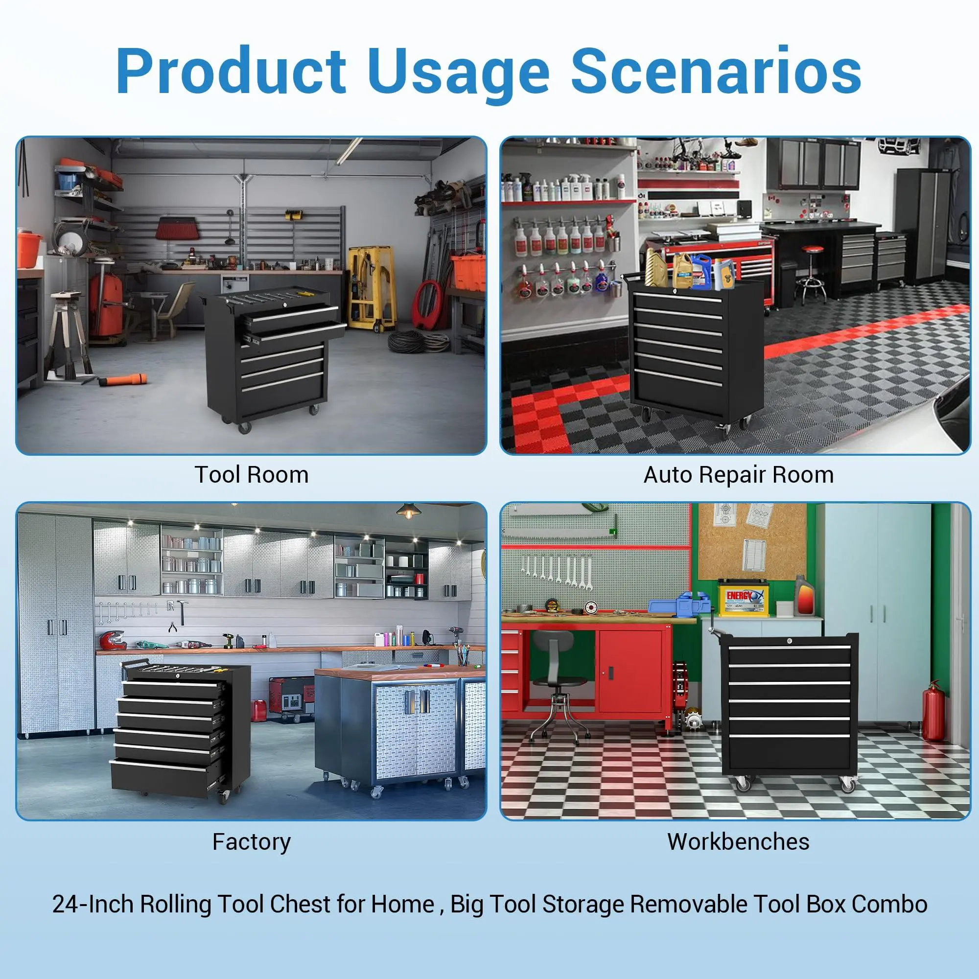 【Durable Steel Construction】 Constructed from high-quality steel with a powder-coated finish, this 24-inch rolling tool chest with 6-drawers offers long-lasting durability and a smooth, easy-to-clean surface that maintains its appearance over time.