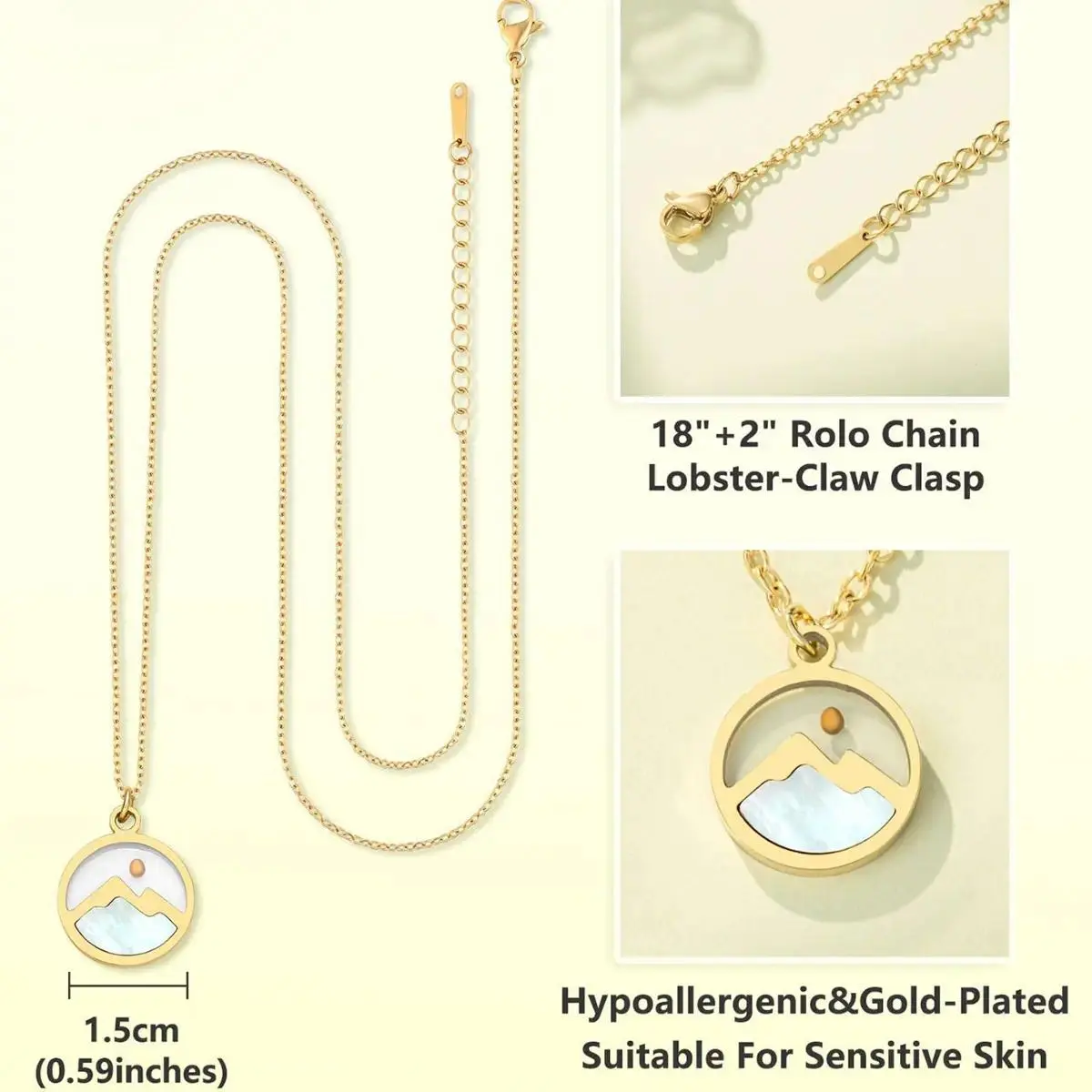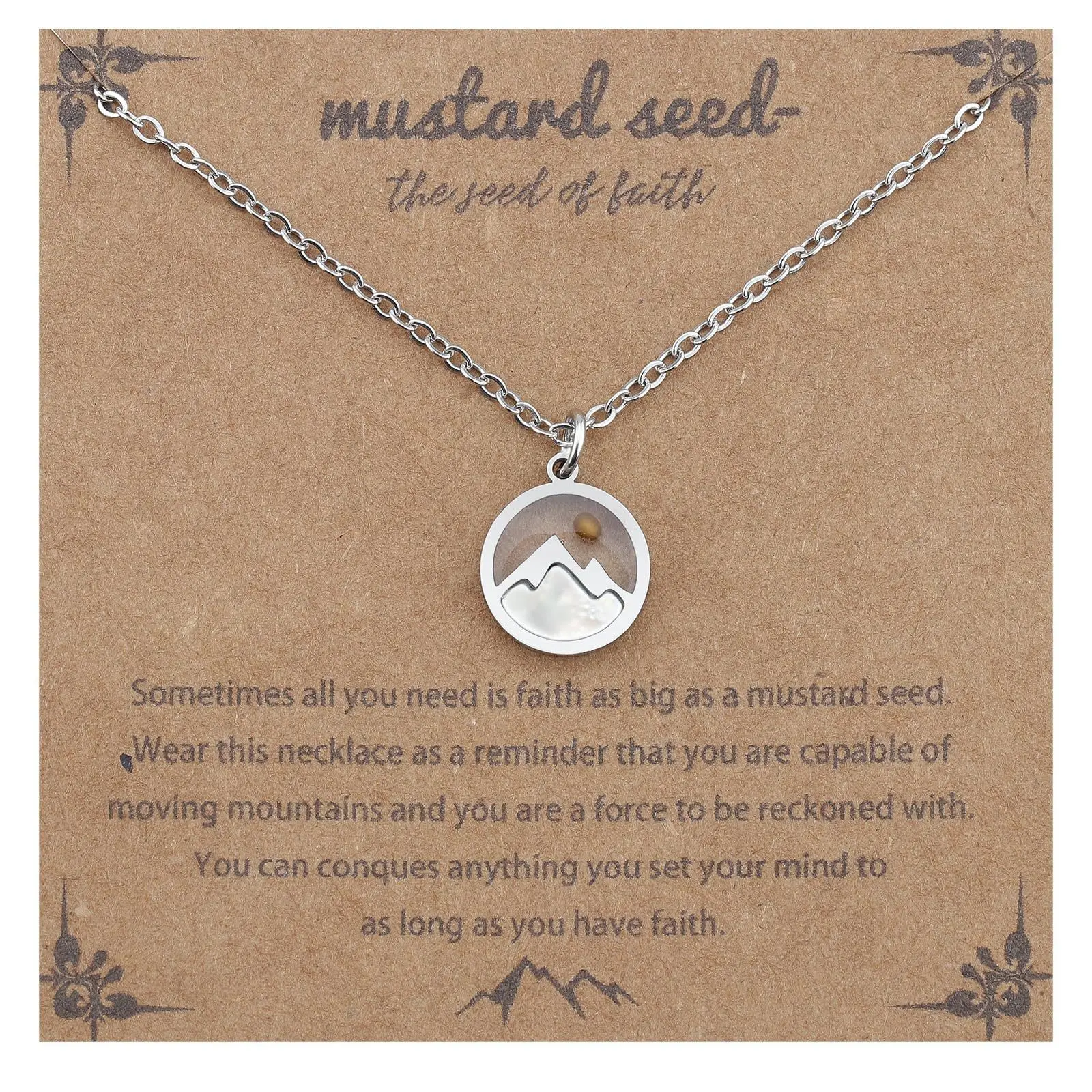 [Package Contents]: You will receive a faith necklace and an inspirational card. This necklace is elegant, unique, and captivating. [Premium Materials]: Our exquisite Christian necklace is made of high-quality stainless steel, making it comfortable, durable, and resistant to breakage or fading, allowing for long-lasting wear. The hypoallergenic and gold-plated material is especially friendly to sensitive skin, eliminating the risk of redness or itching after prolonged wear. It offers maximum comfort for those with sensitive skin. [Size]: The pendant of this necklace is approximately 1.5 cm (0.59 inches) in diameter, making it a delicate and compact piece. The chain is 18 inches long and comes with a 2-inch extender, allowing for flexible adjustment to suit your style, whether creating an elegant, snug fit around your neck or a slightly longer, casual look. [Special Design]: This exquisite necklace, embellished with a mountain and mustard seed motif, is both refined and meaningful, blending fashion and faith. Wear this necklace to stand out in any occasion. [Super Easy to Wear]: The chain features a lobster clasp that opens and closes smoothly, easily one-handed. No more fumbling around when you're in a hurry or need to quickly change accessories. Perfect for all occasions. [A Wonderful Gift]: Our faith pendant necklace is a perfect birthday gift for friends, mothers, grandmothers, and loved ones. It's a meaningful gift for religious women. [After-sales Service]:We pursue product quality and customer satisfaction. If you receive a defective item, please contact us as soon as possible, and we will provide you with a satisfactory solution within 24 hours.