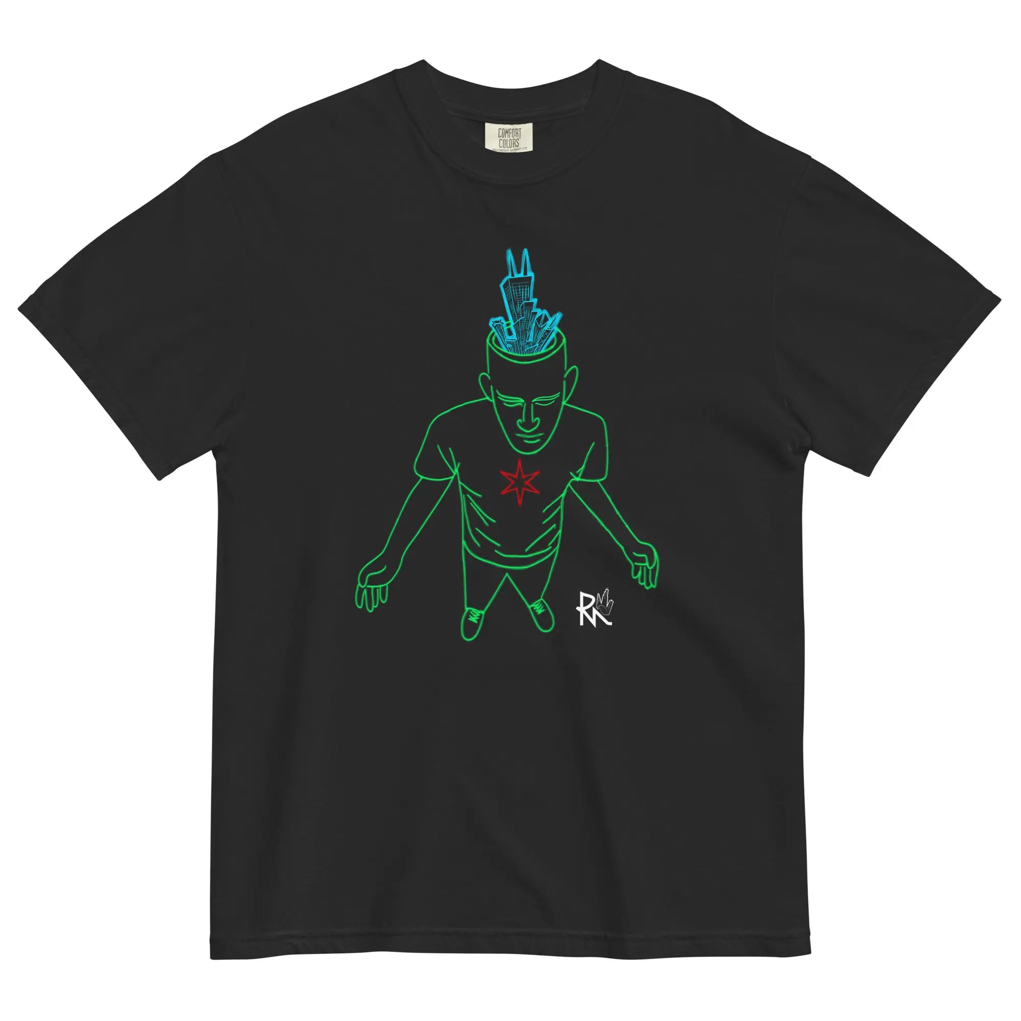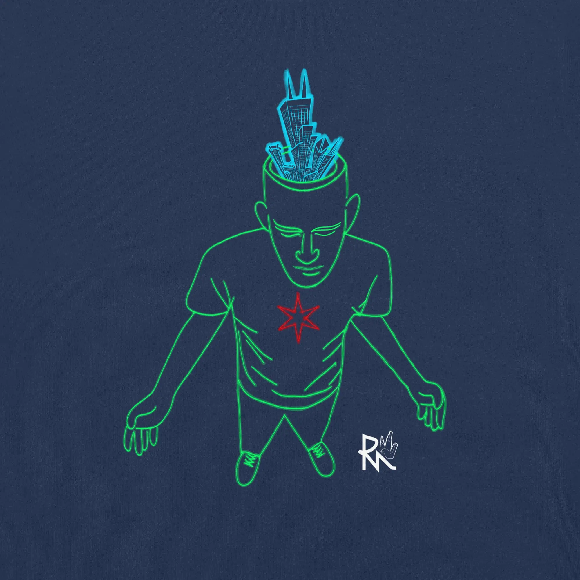 This Chicago State of Mind shirt turns the skyline into something internal. A figure standing still. Chest marked with the red star. Head open with the city rising from within.