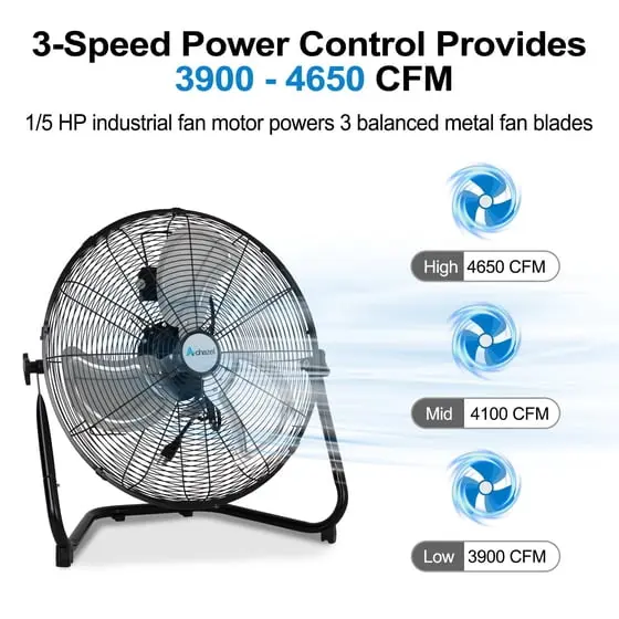 ·The Achazel 20" High Velocity Floor Fan is built to deliver powerful, reliable airflow for demanding environments. With up to 4650 CFM of high-velocity air output, this heavy-duty fan is ideal for cooling large spaces such as garages, workshops, warehouses, gyms, and commercial areas.Designed with a durable all-metal construction and sturdy frame, the fan ensures long-lasting performance even in tough working conditions. The 3-speed control allows you to customize airflow based on your needs, while the versatile tilt head and wall-mount option provide flexible air direction and space-saving installation.Equipped with a built-in carry handle, non-skid feet for added stability, and a 6-foot power cord for convenient placement, the Achazel industrial fan combines power, safety, and ease of use. Backed by a 1-year warranty, it’s a dependable cooling solution you can trust.Powerful High-Velocity Airflow – 3 speed settings deliver up to 4650 CFM (High) / 4100 CFM (Medium) / 3900 CFM (Low), ideal for cooling large garages, workshops, and commercial spacesHeavy-Duty Metal Construction – Built with a sturdy all-metal frame for durability and long-lasting industrial performanceVersatile Tilt & Wall Mount Design – Adjustable tilt head directs airflow where needed, with wall-mount option for flexible and space-saving installationStable & Easy to Move – Features a built-in carry handle and non-skid feet to prevent slipping and wobbling during operationUser-Friendly & Reliable – Includes a 6ft power cord for convenient placement and comes with a 1-year warranty for peace of mind