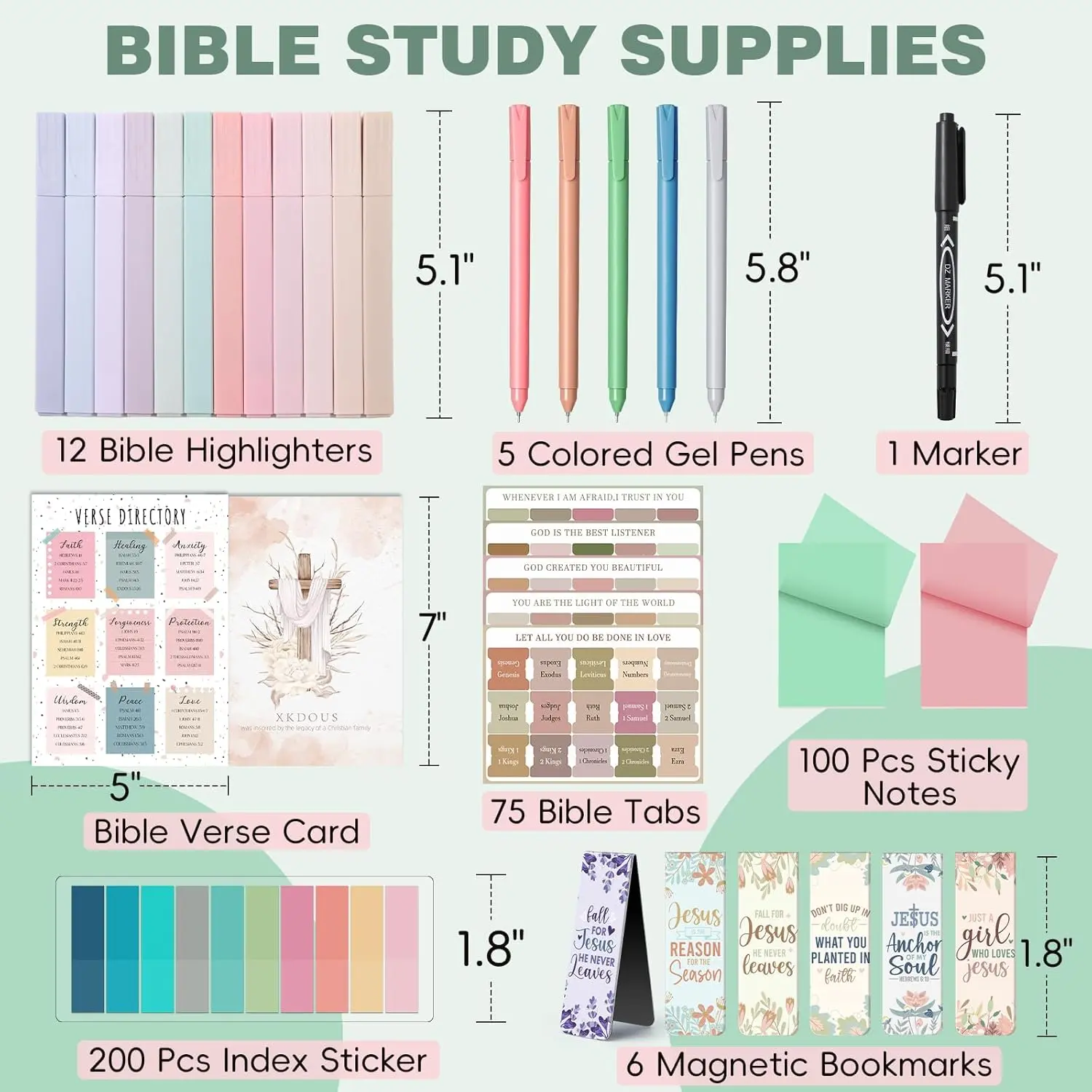 ·The Bible Accessories Kit Includes: 75 bible tabs, 12 no bleed bible highlighters, 5 colored gel pens, 1 marker, 2 sticky notes, 1 colored index sticker, 6 magnetic bookmarks, and 1 Bible verse directory card