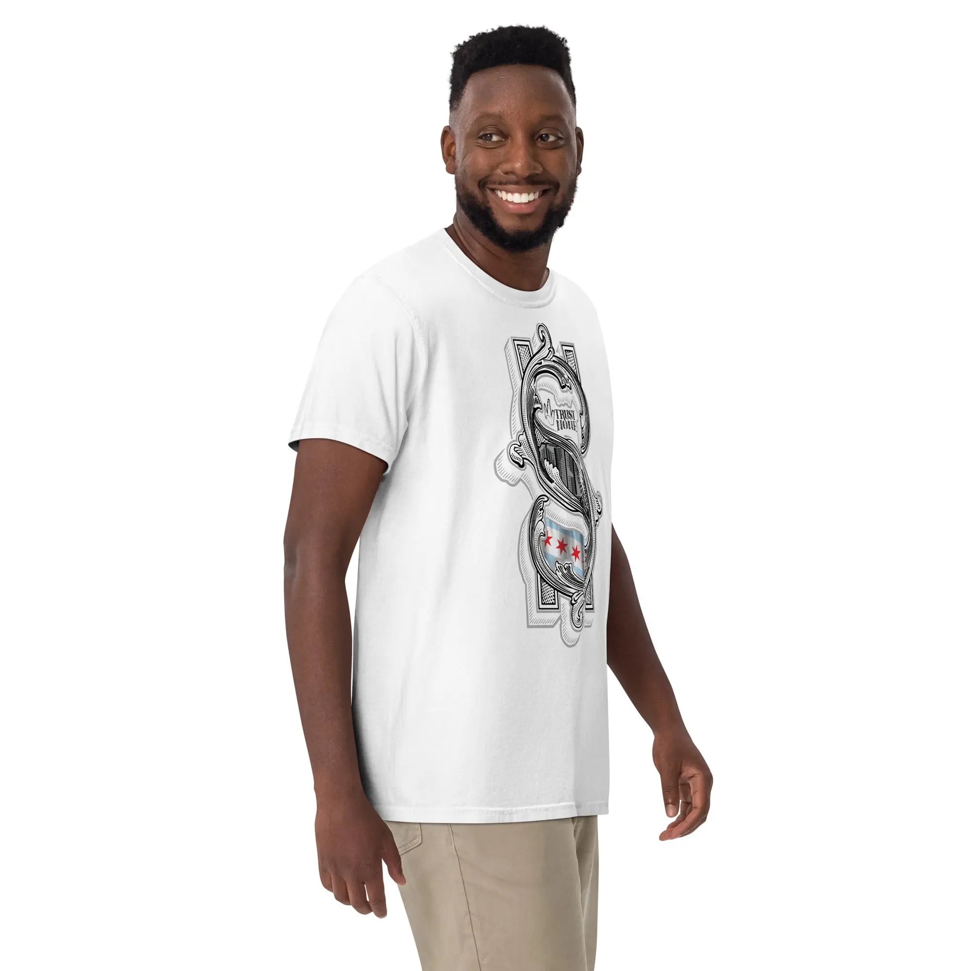An intricate dollar mark wraps around the Chicago flag and skyline, turning a symbol of currency into a symbol of code. Precision linework. Structured composition. Every detail deliberate.