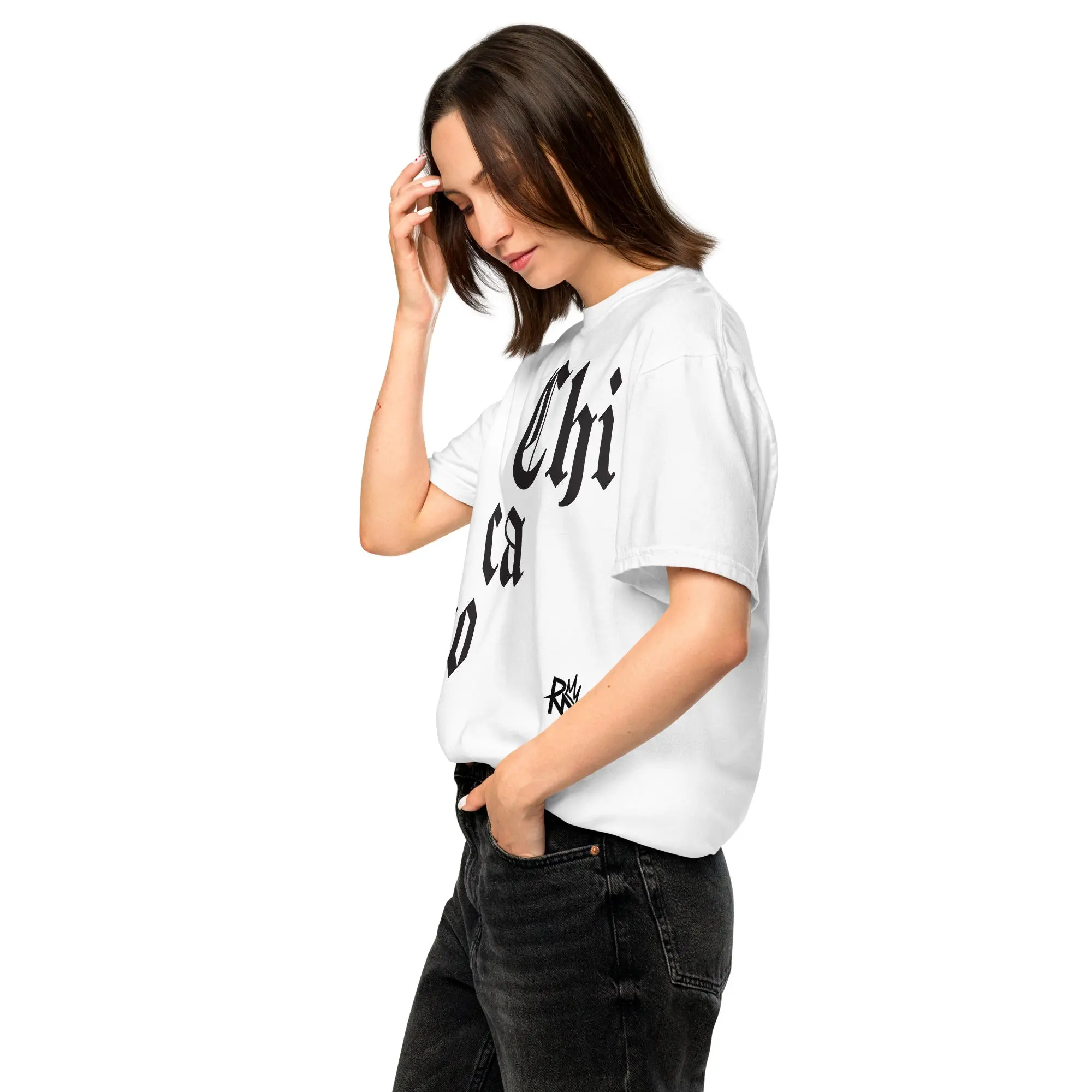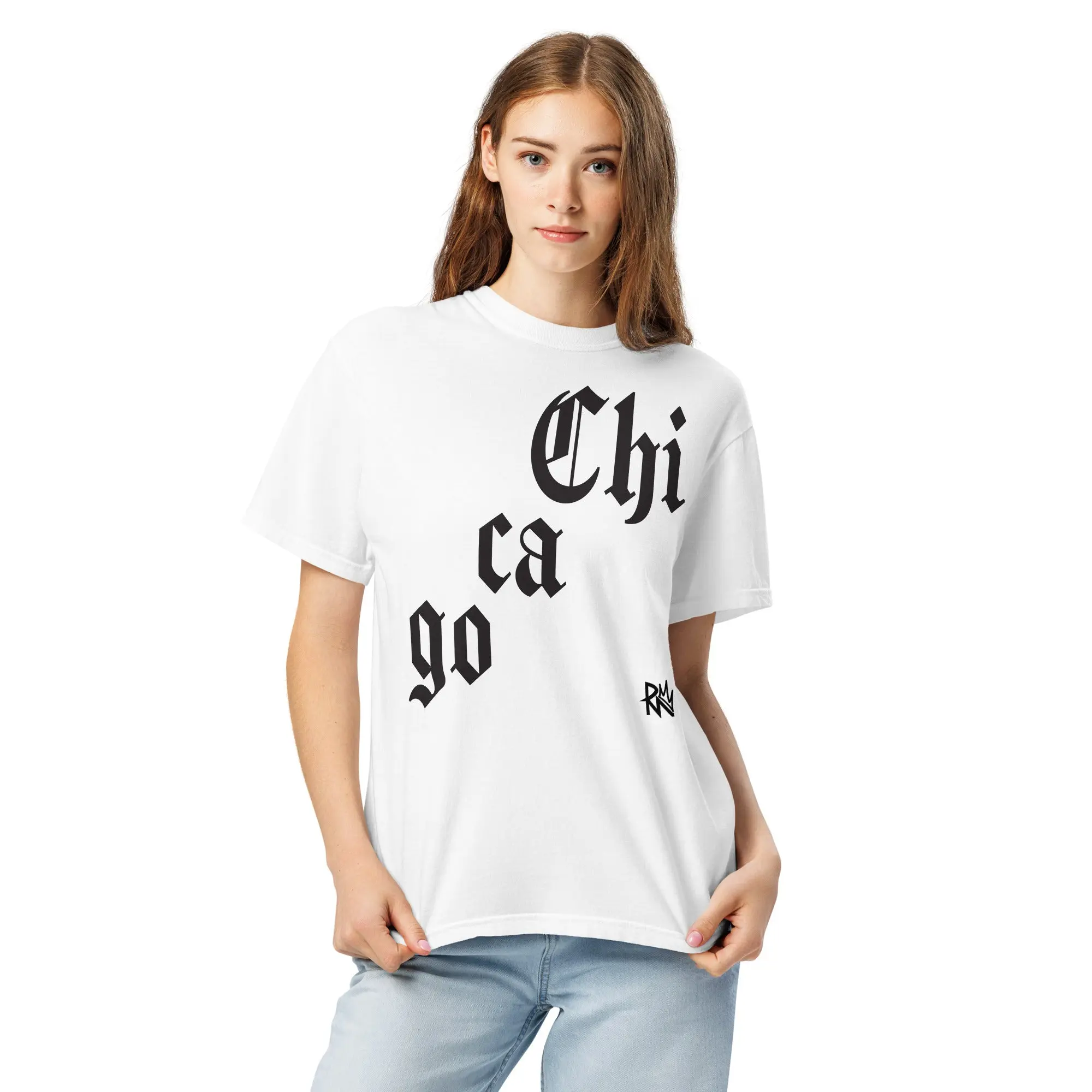 This Old English Chicago shirt keeps it stripped down and heavy. “Chicago” printed diagonally across the chest in bold Old English type. Flipped. Clean. Unapologetic.