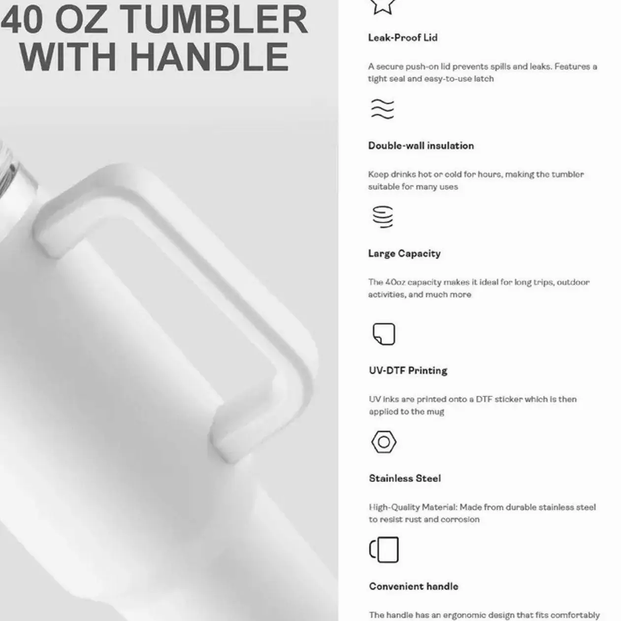 Ergonomic Handle (40oz): Designed for easy carrying all day long.