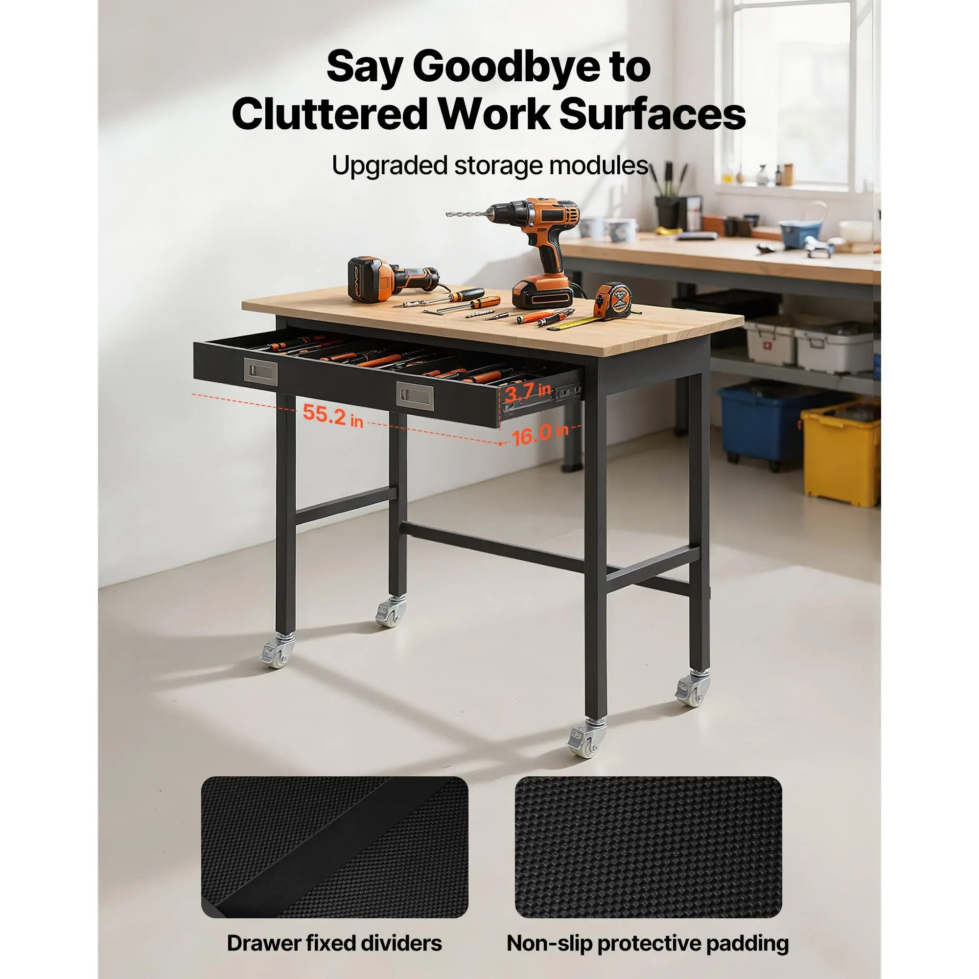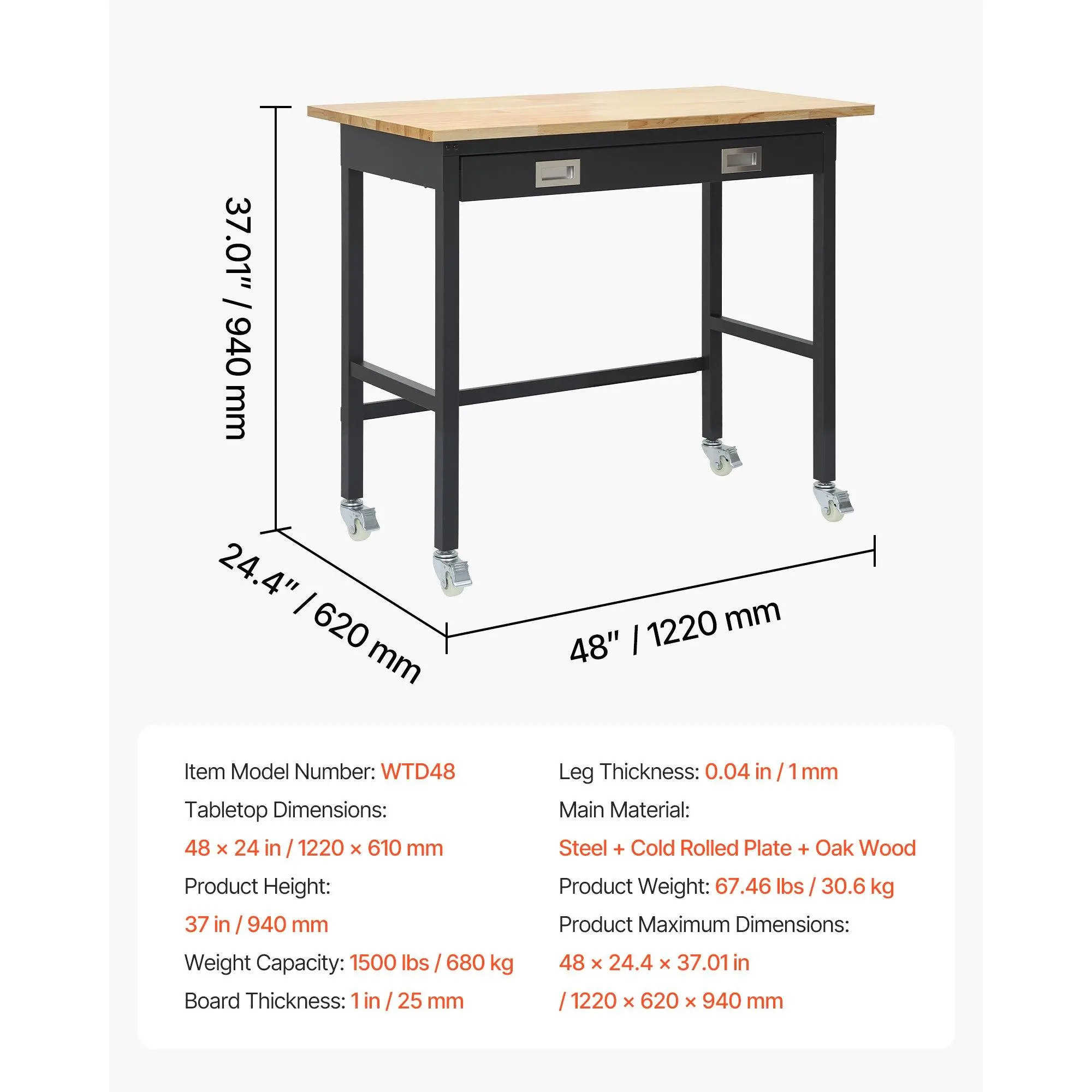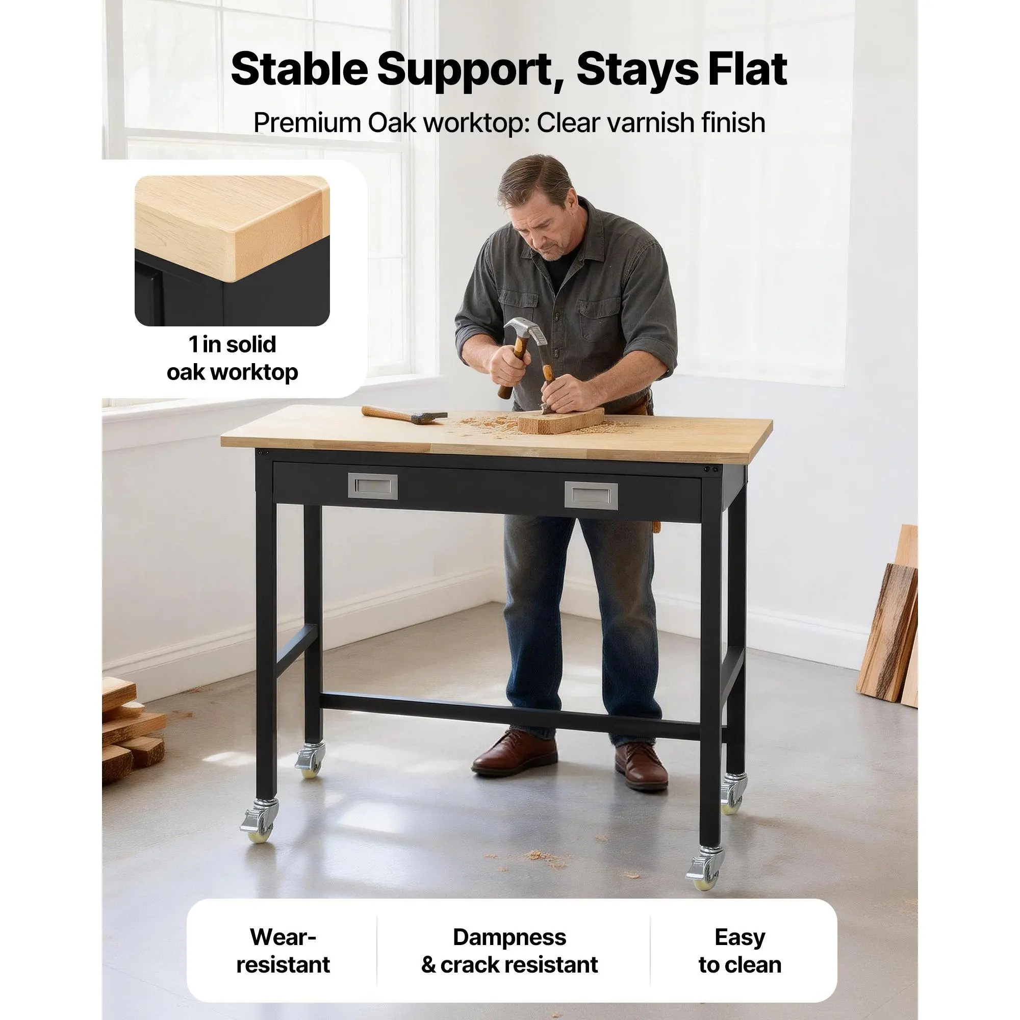 Super Strong 1500 lbs Load: This 48 x 24-inch workbench holds up to 1500 lbs (680 kg), great for heavy tasks like carving, welding, or cutting.With 4 lockable casters, it’s easy to move and lock securely wherever you need itBuilt-in Storage: Declutter in style!This workshop bench features a wide drawer with 3 fixed sections for tools.Side hooks for your go-to tools keep everything neat, saving you time and boosting your efficiencyPremium Oak Top: This garage workbench features a sturdy 1-inch thick oak tabletop that’s tough, wear-resistant, and built to last.Varnished to resist dampness and stains, it’s easy to clean-just wipe with a damp cloth and it’s good as newSturdy Structure, Built to Last: Made with high-quality steel, the 1 mm thick frame provides unmatched stability and durability.Coated to resist corrosion and rust, this hardwood workbench is designed to last for years, supporting your heaviest tasks with easeVersatile Use: Ideal for any space-workshop, garage, office, or kitchen!Whether you’re storing heavy items or working on tough projects, this multifunctional workbench offers reliable, sturdy support wherever you need itVEVOR 48-inch Workbench, 1500 lbs Load Capacity, Garage Workbench with Drawer Storage & Wheels, Workshop Bench on Wheels, Heavy Duty Oak Wood Top Work Table for Garage, Workshop, Office, and Home