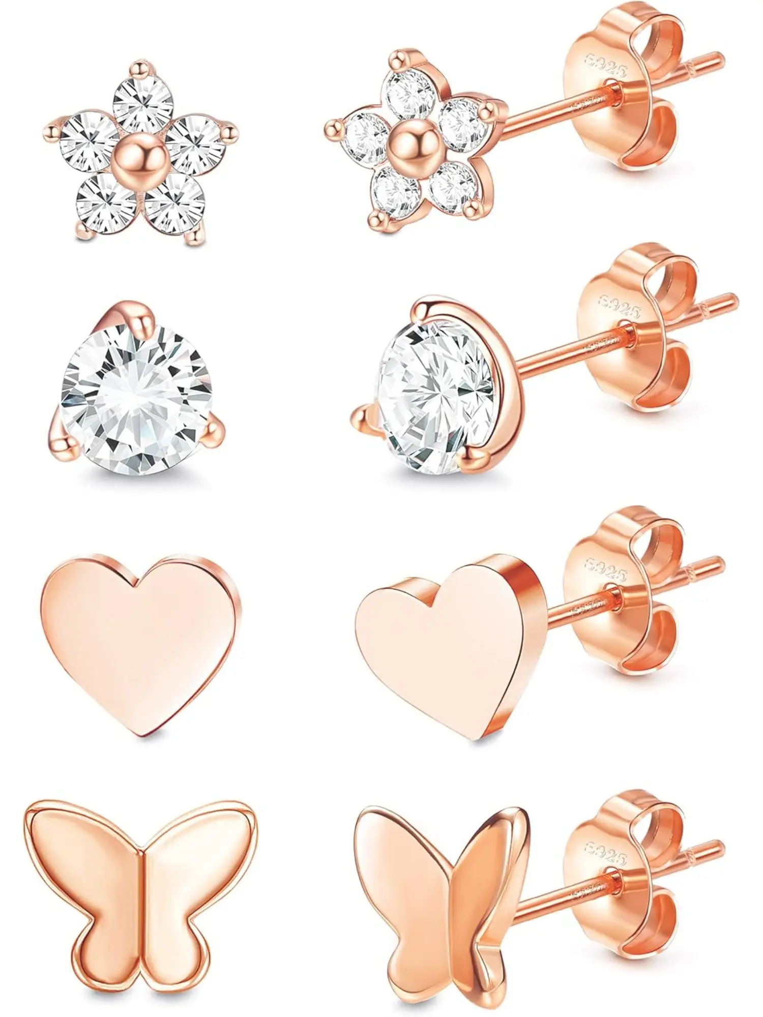 4 Pairs Silvery Stud Earrings Set for Women Heart CZ Butterfly Flower Stud Earrings Hypoallergenic Cubic Zirconia Cartilage Earrings Set