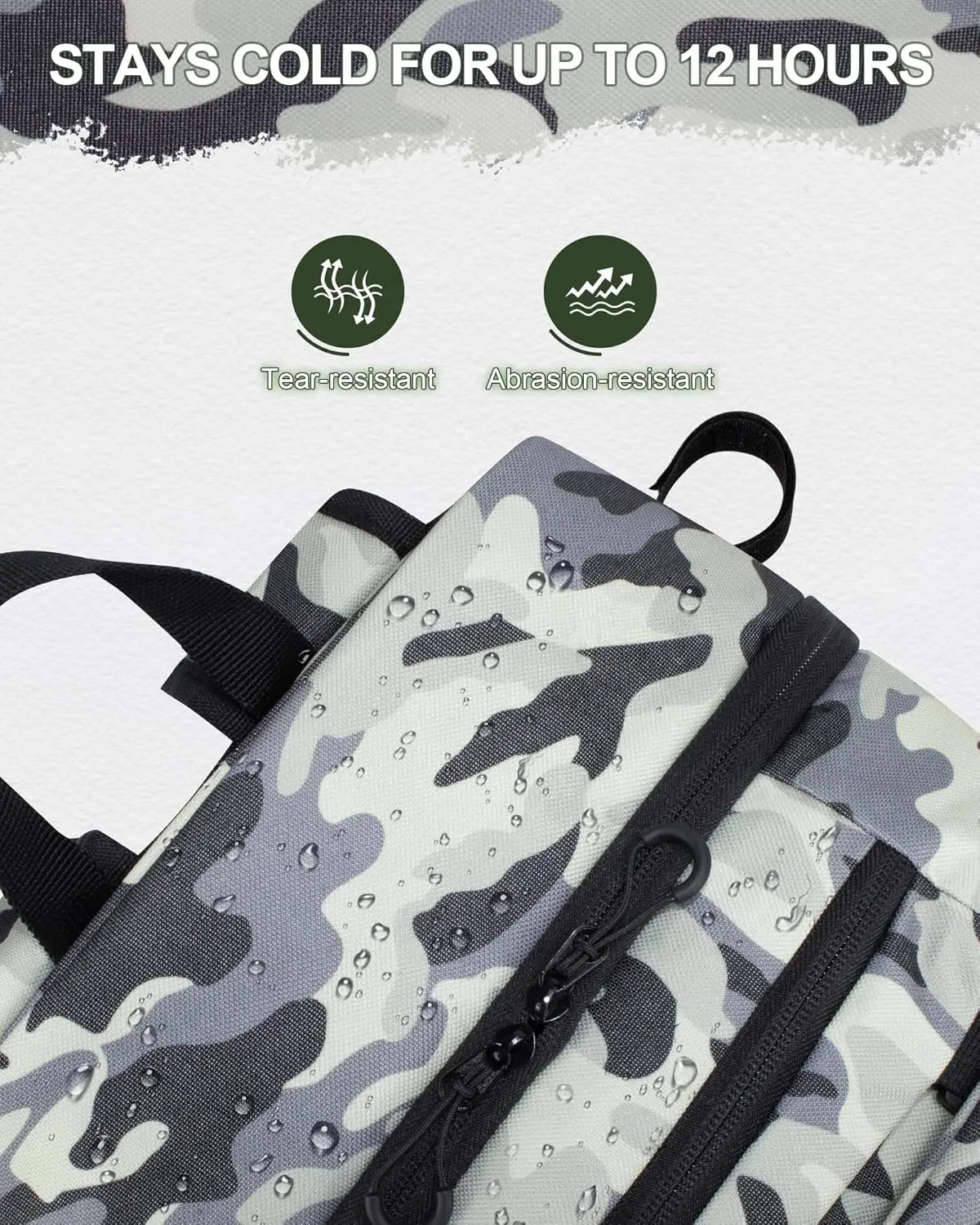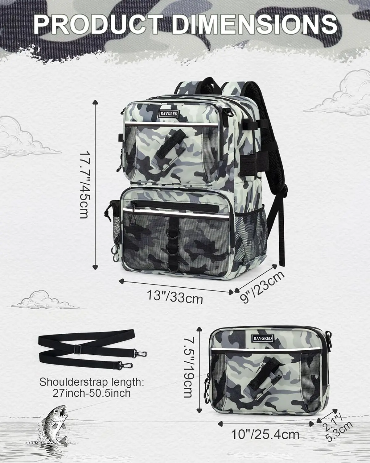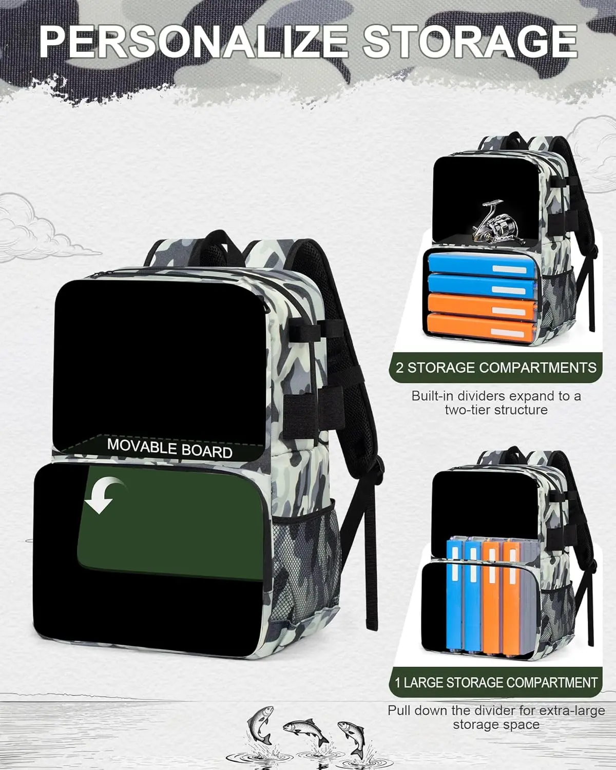 ·CUSTOMIZABLE MAIN COMPARTMENT: The main compartment features removable padded dividers, allowing flexible switching between a single large space and two independent compartments. The upper section is ideal for clothing and snacks, while the lower compartment accommodates fishing tackle boxes with a zippered panel for quick access