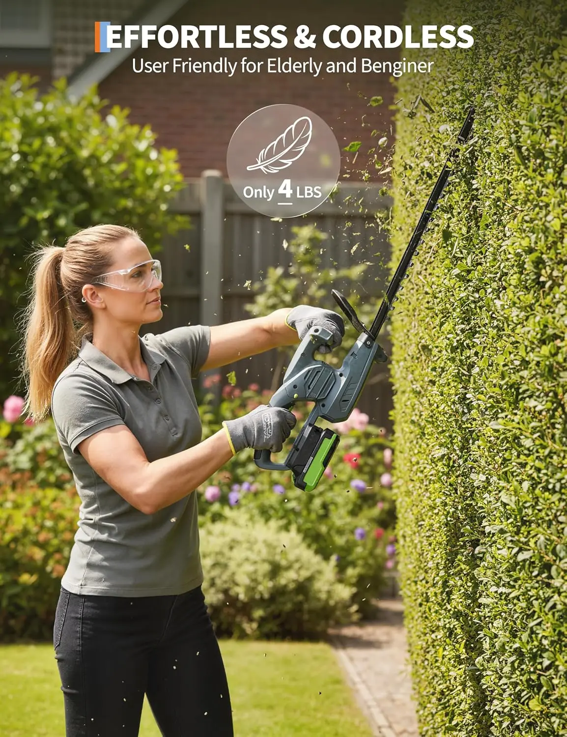 ·【LIGHTWEIGHT AND EASY TO HANDLE】 Only 4 lb for easier carry and control during everyday trimming tasks. A practical choice for homeowners who want a manageable cordless hedge trimmer for small-to-medium jobs.