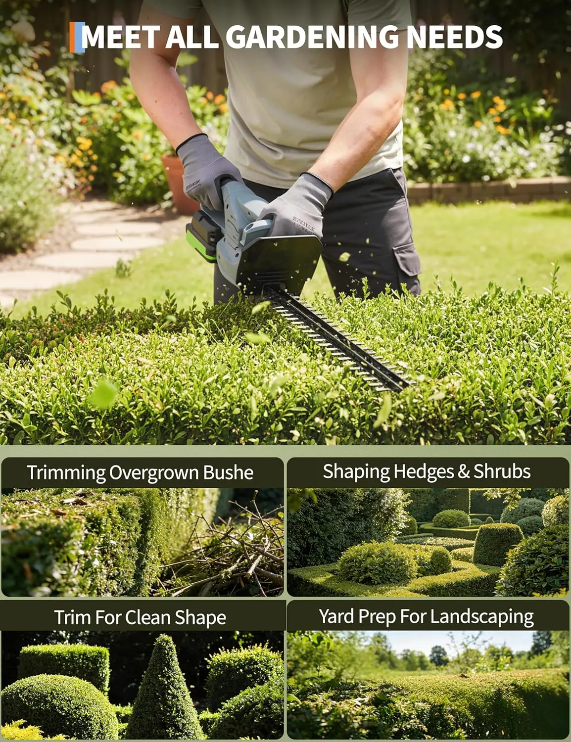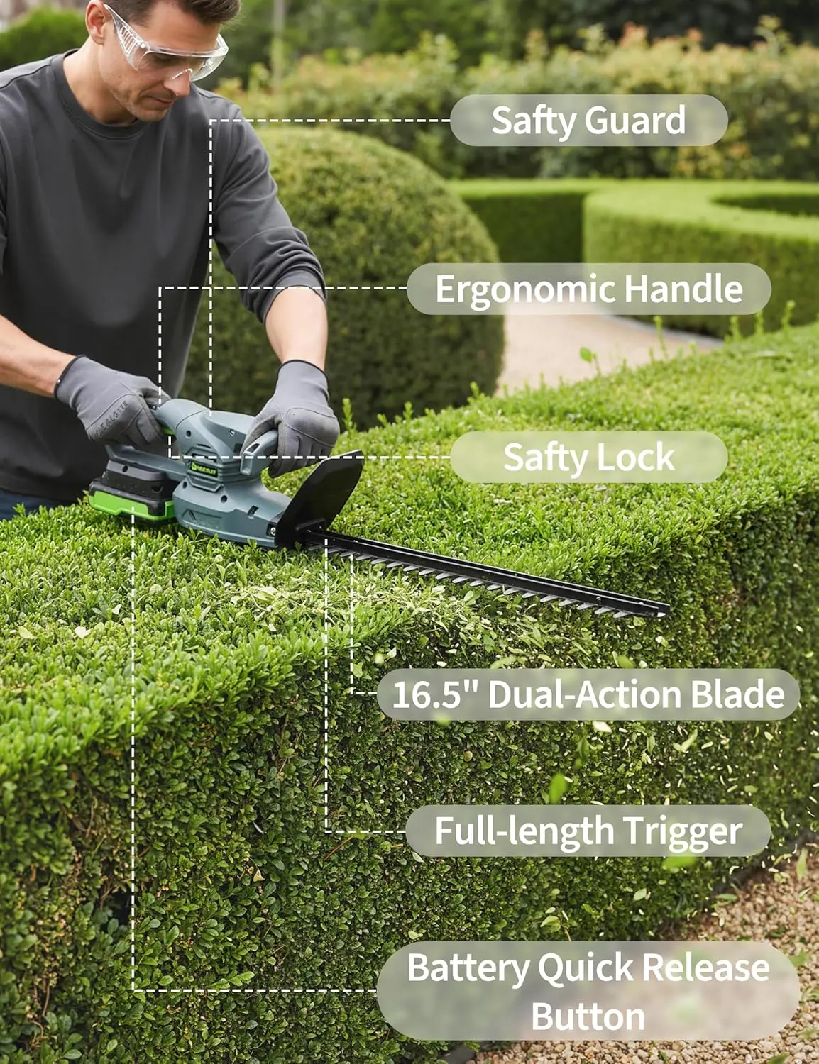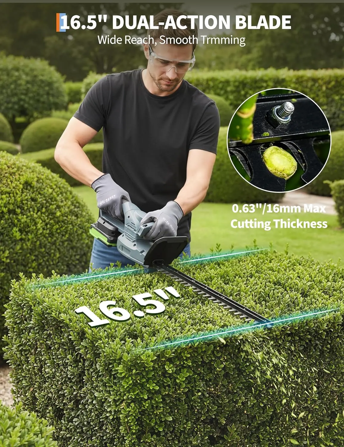 ·【CUTTING PERFORMANCE】 17.7-inch dual-action blades deliver smooth trimming; up to 0.63 in (16 mm) cutting capacity for routine hedge and shrub shaping. Powered by a 400W motor with 1500 RPM no-load speed.