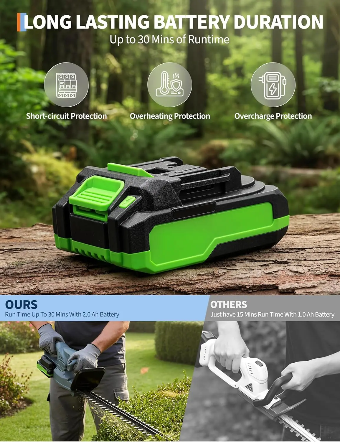·【CORDLESS KIT INCLUDED】 Includes 18V 2.0Ah battery and charger for grab-and-go yard work; enjoy up to 30 min runtime (depending on material and usage). No cord to drag around bushes and hedges.