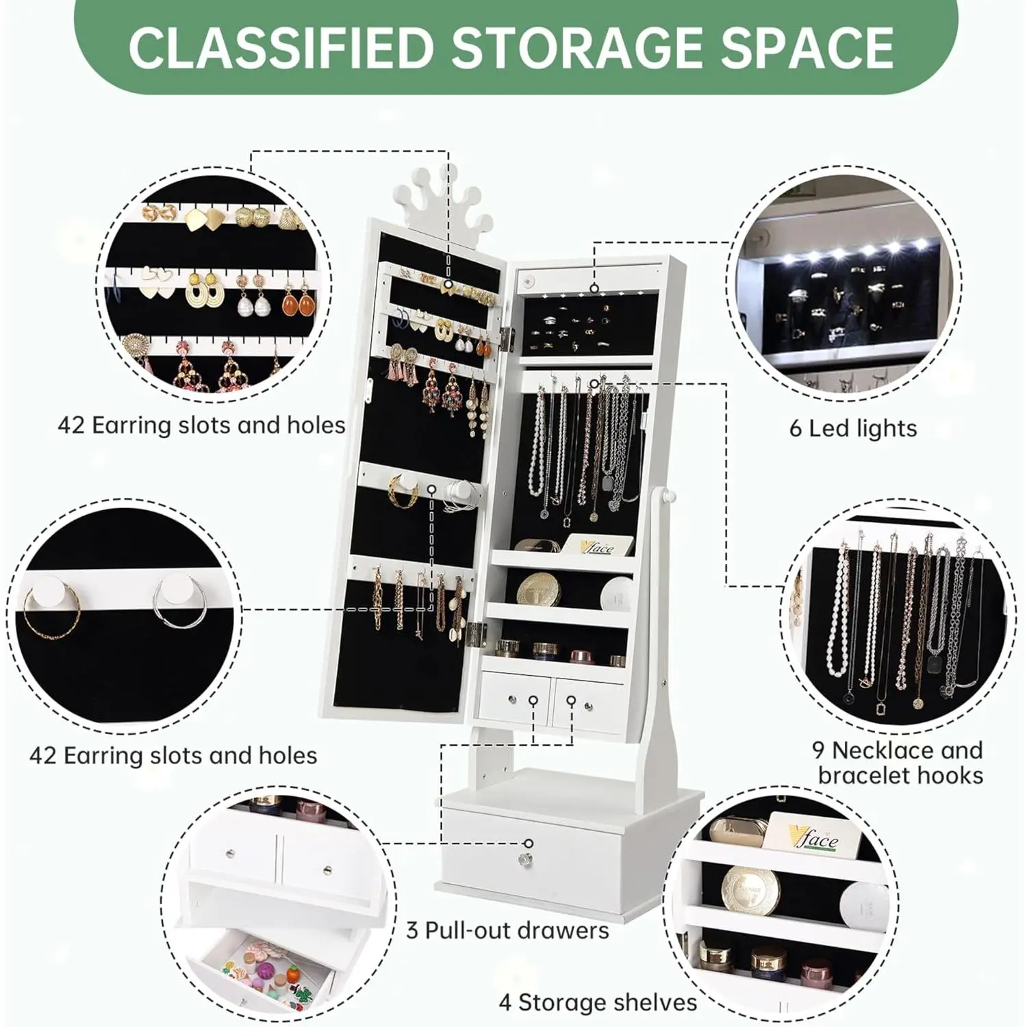 【Full-length Mirror with LED】Measuring 28 in x 8 in in size, this stunning full-length mirror allows your kids to see their outfit from head to toe. And the 2-level tilt adjustment is convenient for them to find the perfect viewing angle. The kids mirror jewelry organizer will illuminate your space from the inside to the outside. The exterior is a comprehensive mirror with LED light band designed by touch screen, and the interior is equipped with 6 LED atmosphere lights.