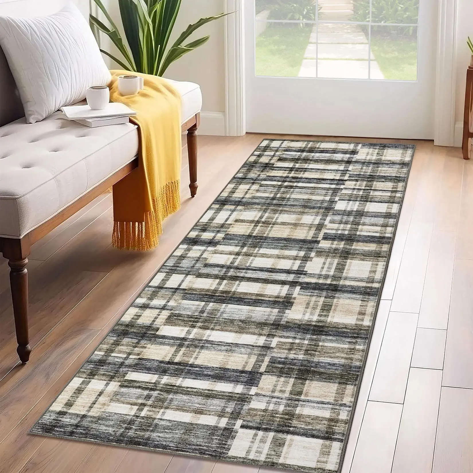 2 x 6 ft Polyester Blue Beige Rectangular Hallway Entryway Bathroom Kitchen Geometric Checkered Modern Machine Washable Runner Rug-A