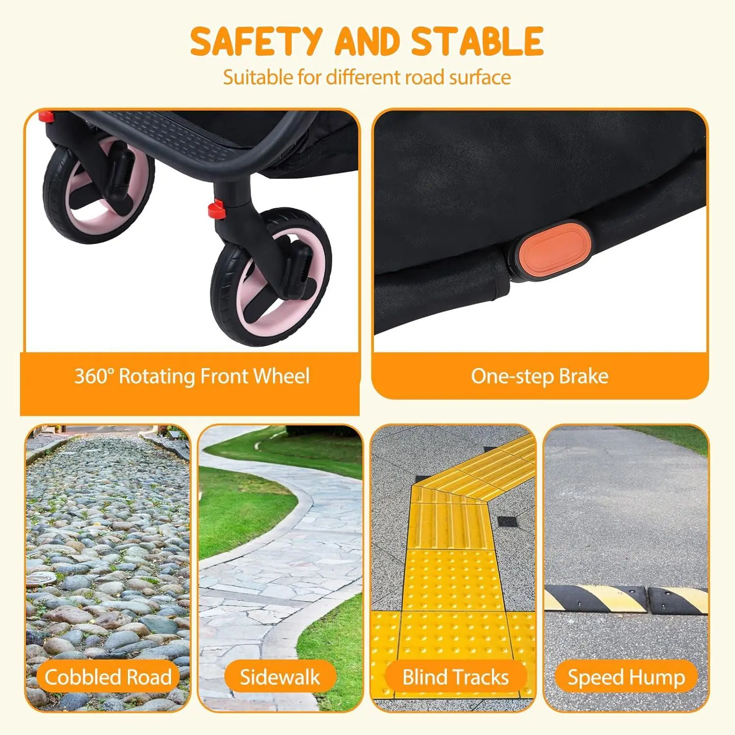 【Sturdy Structure & All-Terrain Adaptability】The compact stroller with an aluminum frame is lightweight but stable, combined with 360° swivel front wheels to smoothly navigate cobblestone roads, sidewalks, steps, and other complex terrains, ensuring    a smoother and more comfortable ride.