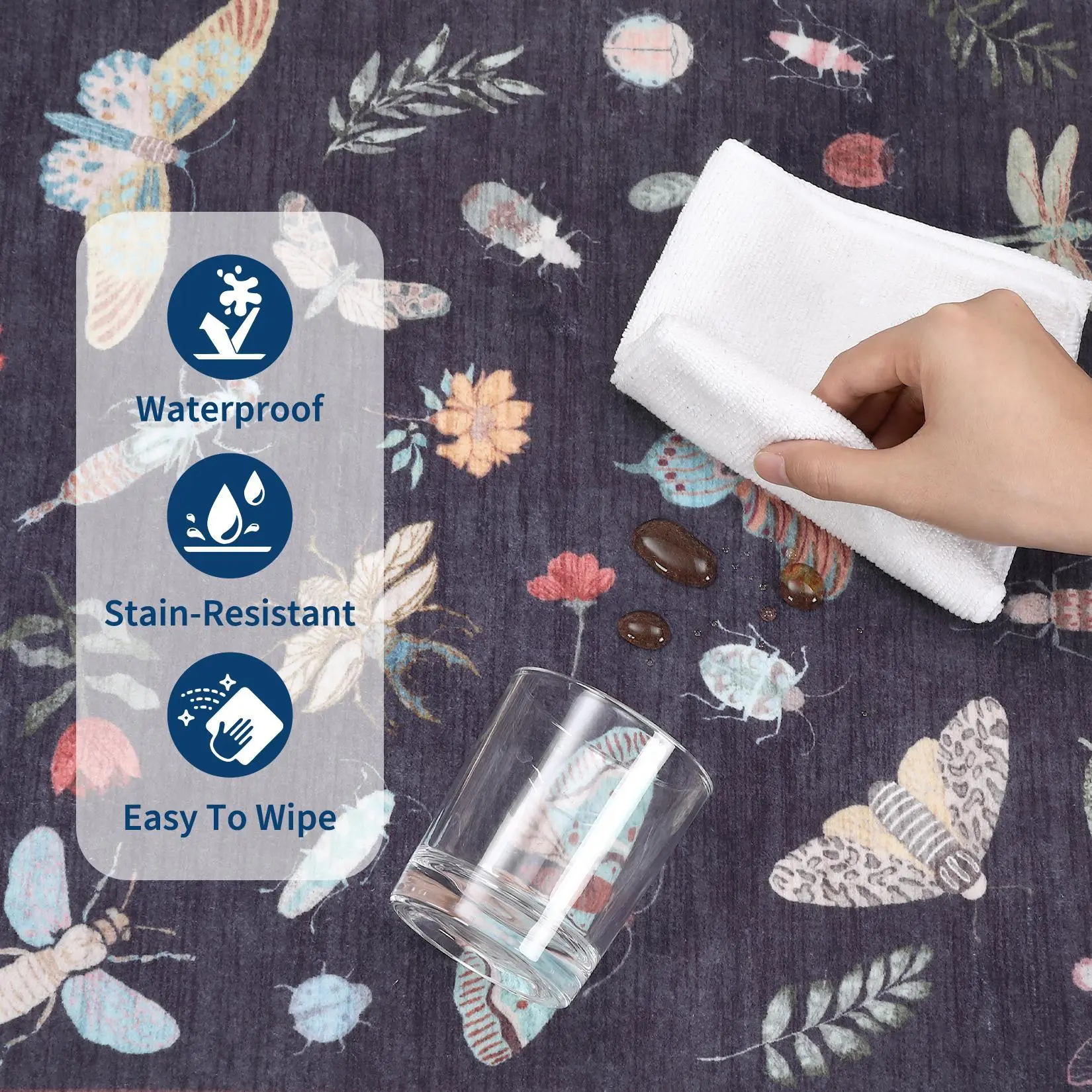 This area rug features a whimsical insects pattern, bringing a playful and nature-inspired charm to your space with its intricate and lively design.