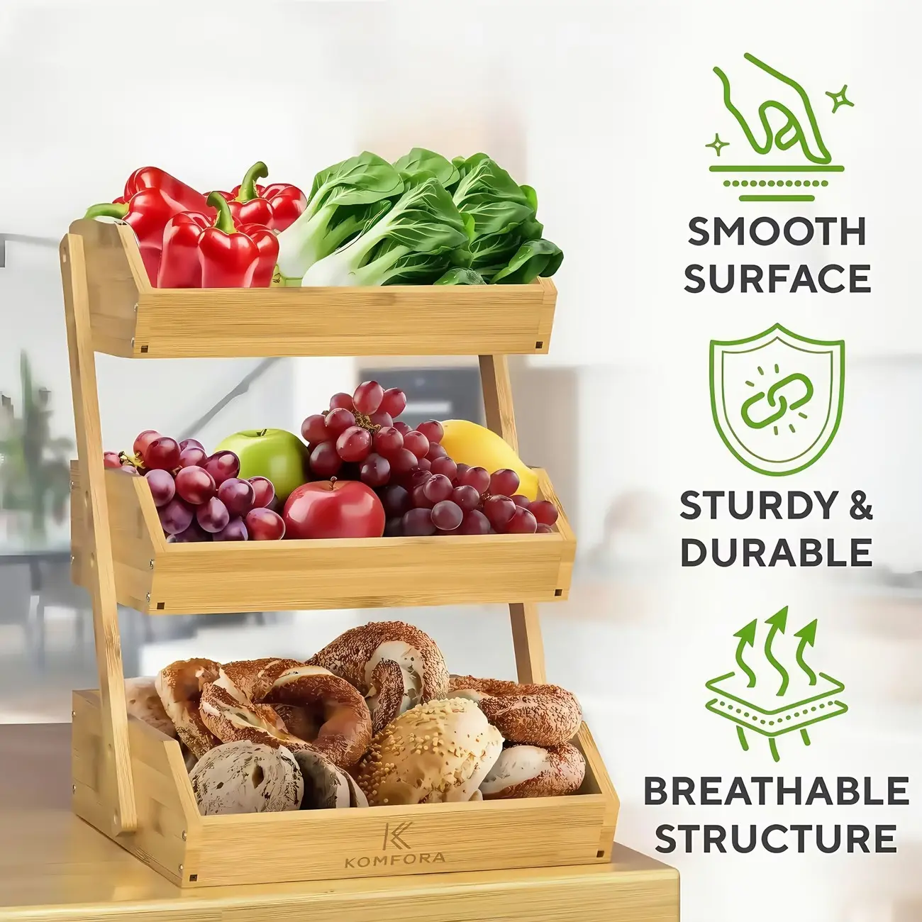Maximize your kitchen space with this multi-tier fruit basket. Designed to keep fruits and vegetables neatly organized, it helps maintain freshness with an open airflow structure that promotes proper ventilation.