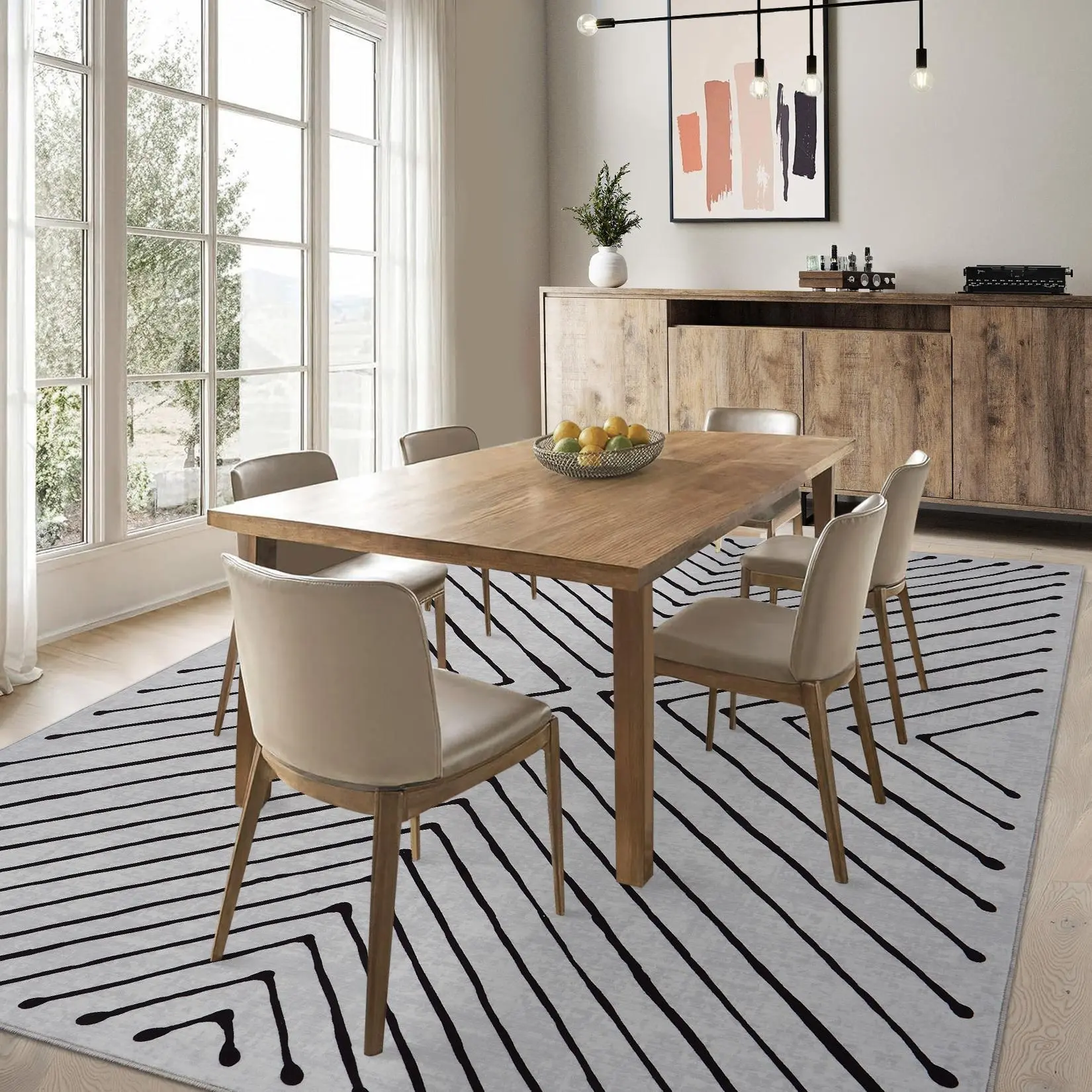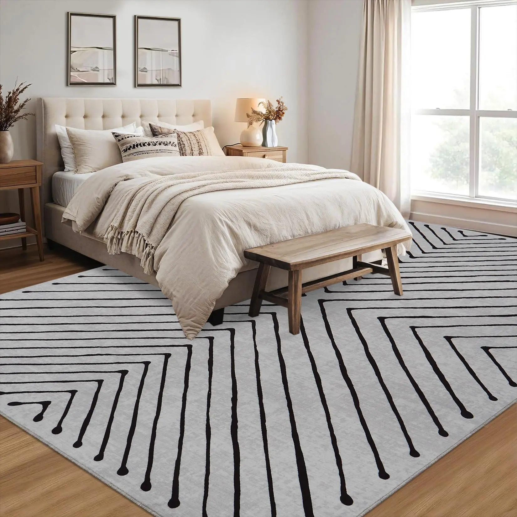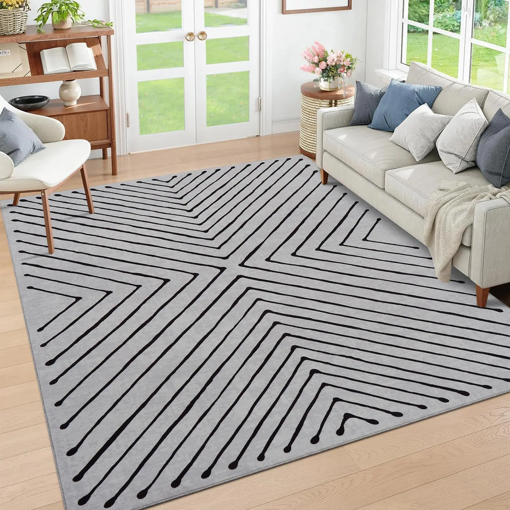 Amplify the sleek elegance of your striped area rug by pairing it with minimalist decor and textured throws to create a balanced and sophisticated aesthetic.