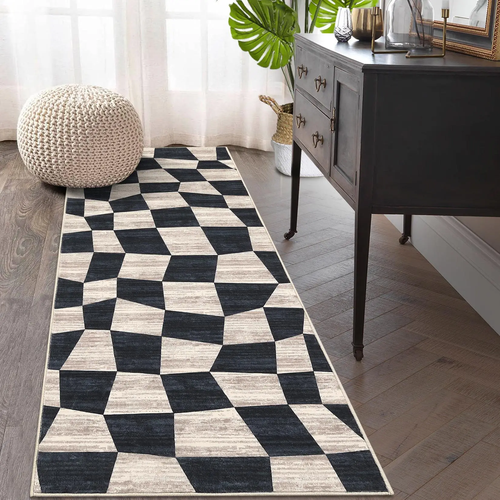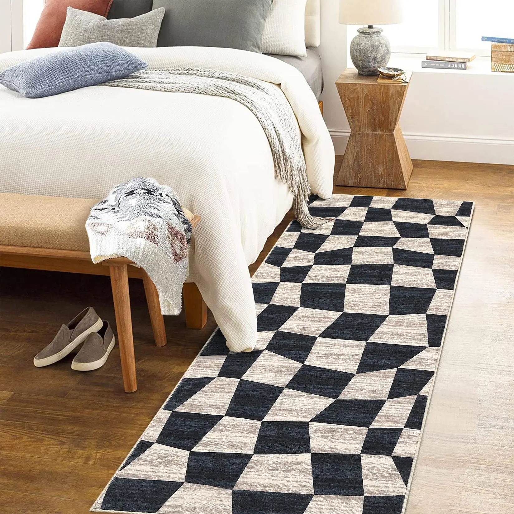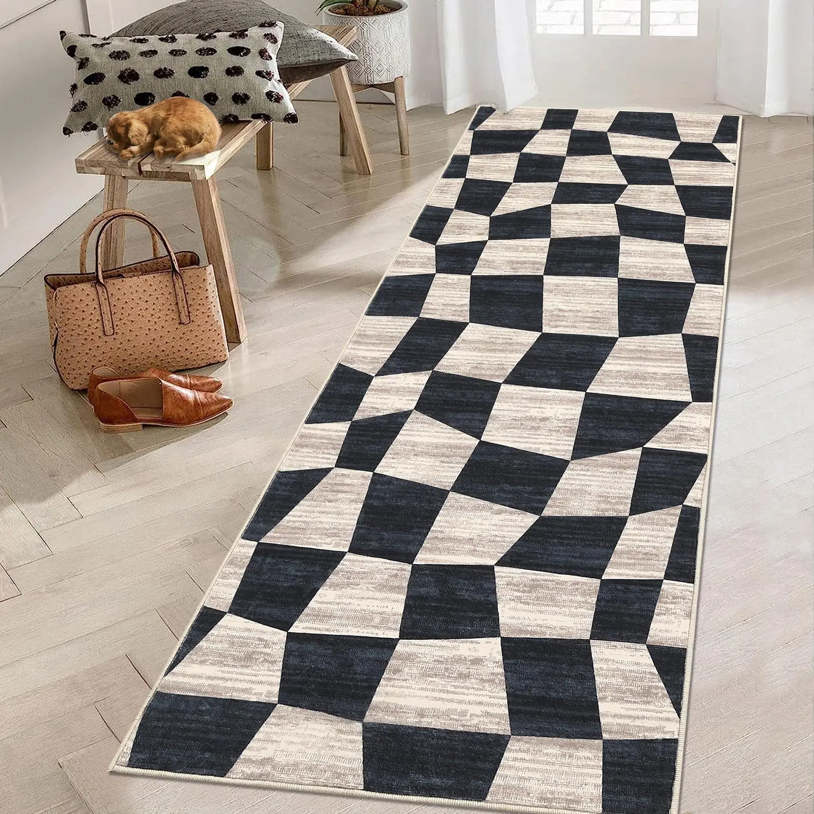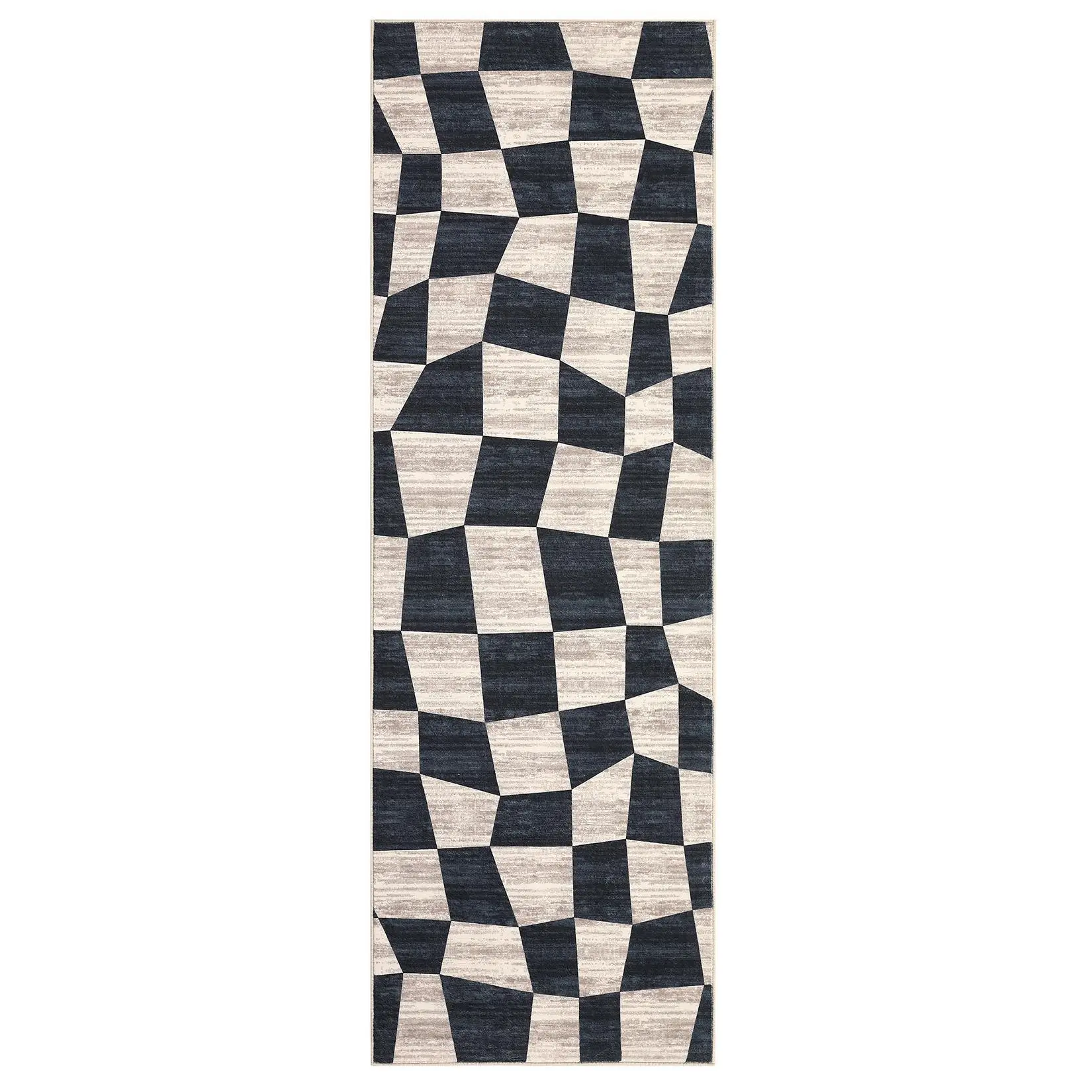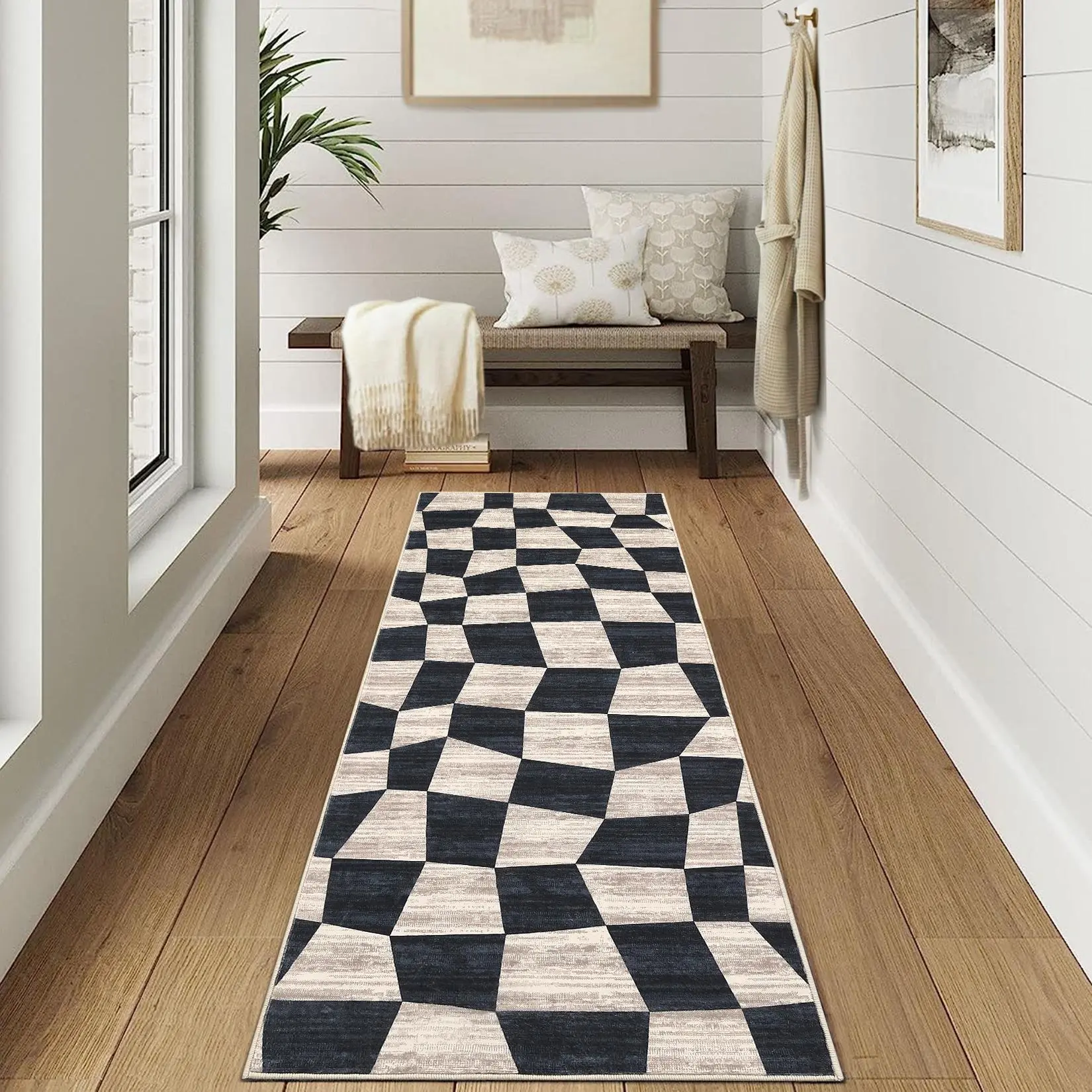 2 x 6 ft Polyester Dark Blue Rectangular Hallway Entryway Bathroom Kitchen Geometric Checkered Modern Machine Washable Runner Rug-C