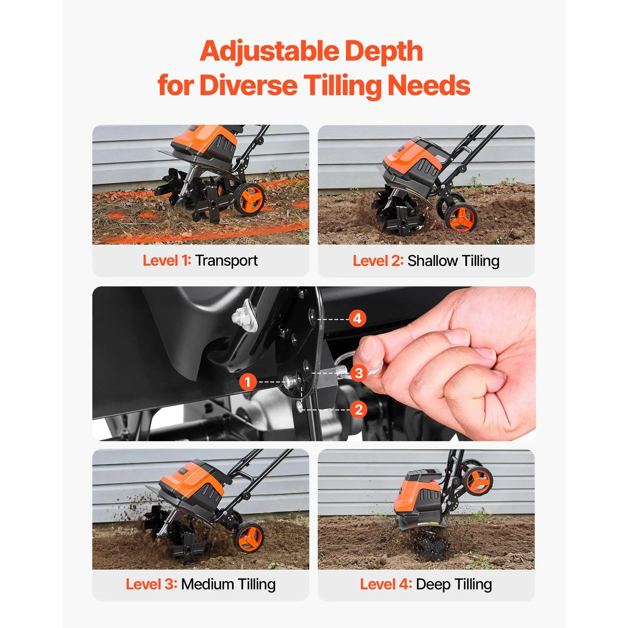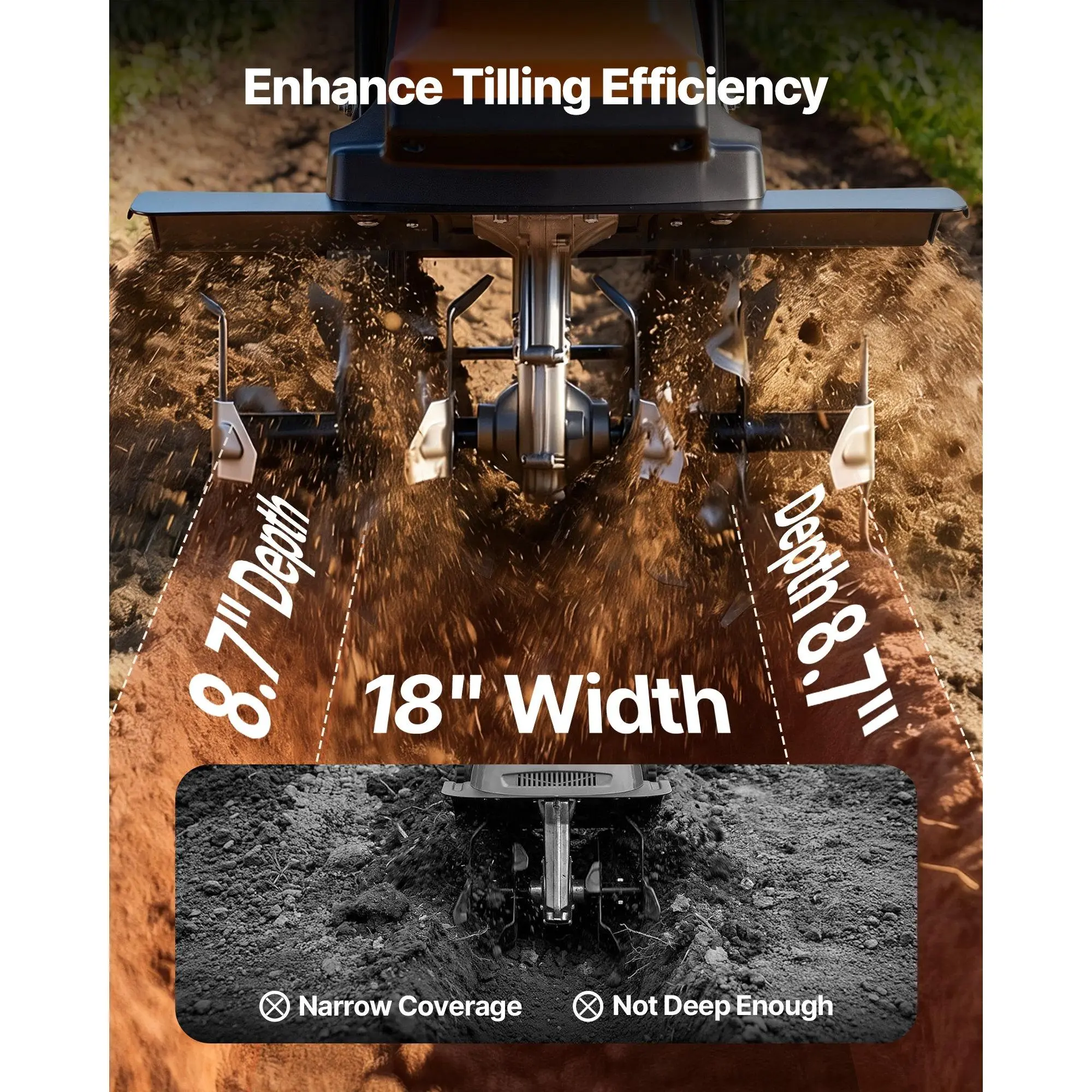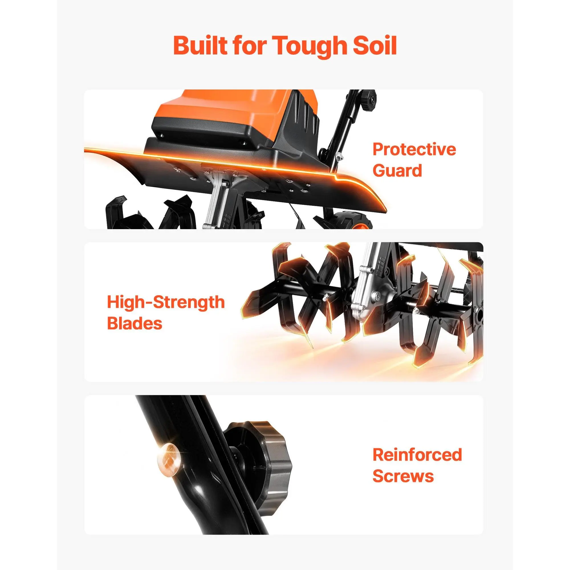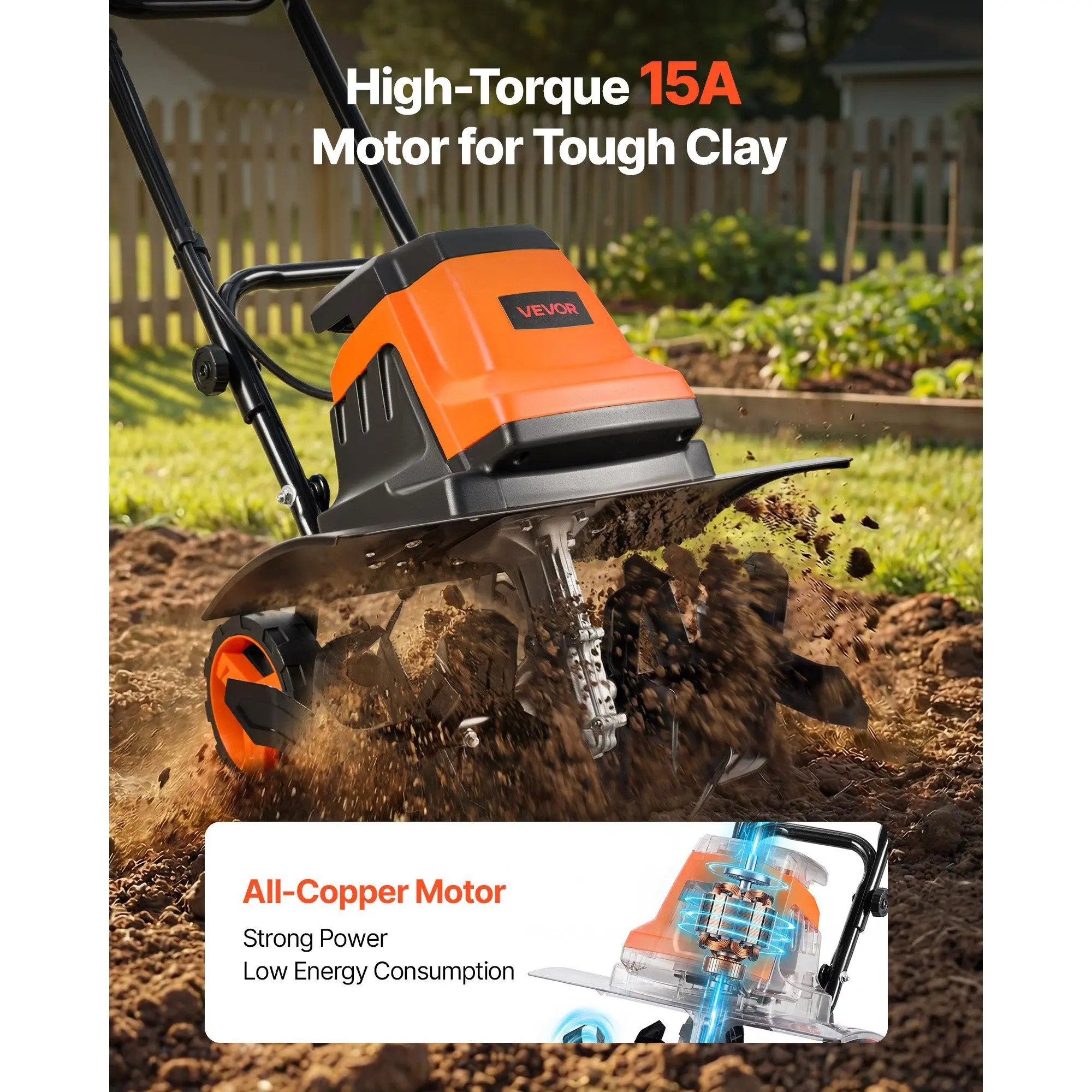 Powerful Core Motor: The electric tiller is equipped with a 15A full copper motor.It works efficiently even in hard soil without jamming, fits the North American 120V standard voltage, and meets the tilling needs of both farmers and home gardenersHigh-Efficiency Tilling: 18-inch ultra-wide tilling width boosts efficiency by over 30%; Max 8.7-inch depth meets deep planting needs; 6 blades x 4 tines design helps shorten working time.Our garden tiller is ideal for farmland and home gardensSecure & Mobile Operation: The heavy-duty tilling machine is equipped with a lock and overload guard to reduce accidental activation and help safeguard the motor.Durable PP wheels allow smooth, all-terrain movement, improving controlReinforced Build: The shield plate helps block flying debris, while the high-hardness tines resist edge rolling during long-term use.Thickened screws fasten directly to the electric rototiller body, enhancing vibration resistance at key jointsErgonomic & Space-Saving Design: The corded garden rototiller features a H-shaped handle for more comfortable and flexible operation.A built-in cord retention device avoids cable tangling.It folds down to half its size, making storage simpleVEVOR Corded Electric Tiller, 18 Inch Tilling Width Garden Rototiller, 15-Amp Motor Heavy-Duty Tilling Machine, Cultivator with Steel Tines and Foldable Handle, for Lawn, Yard, and Gardening Care